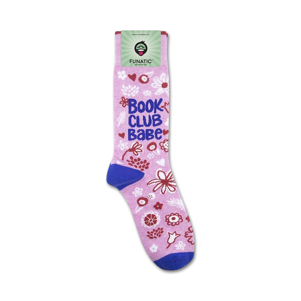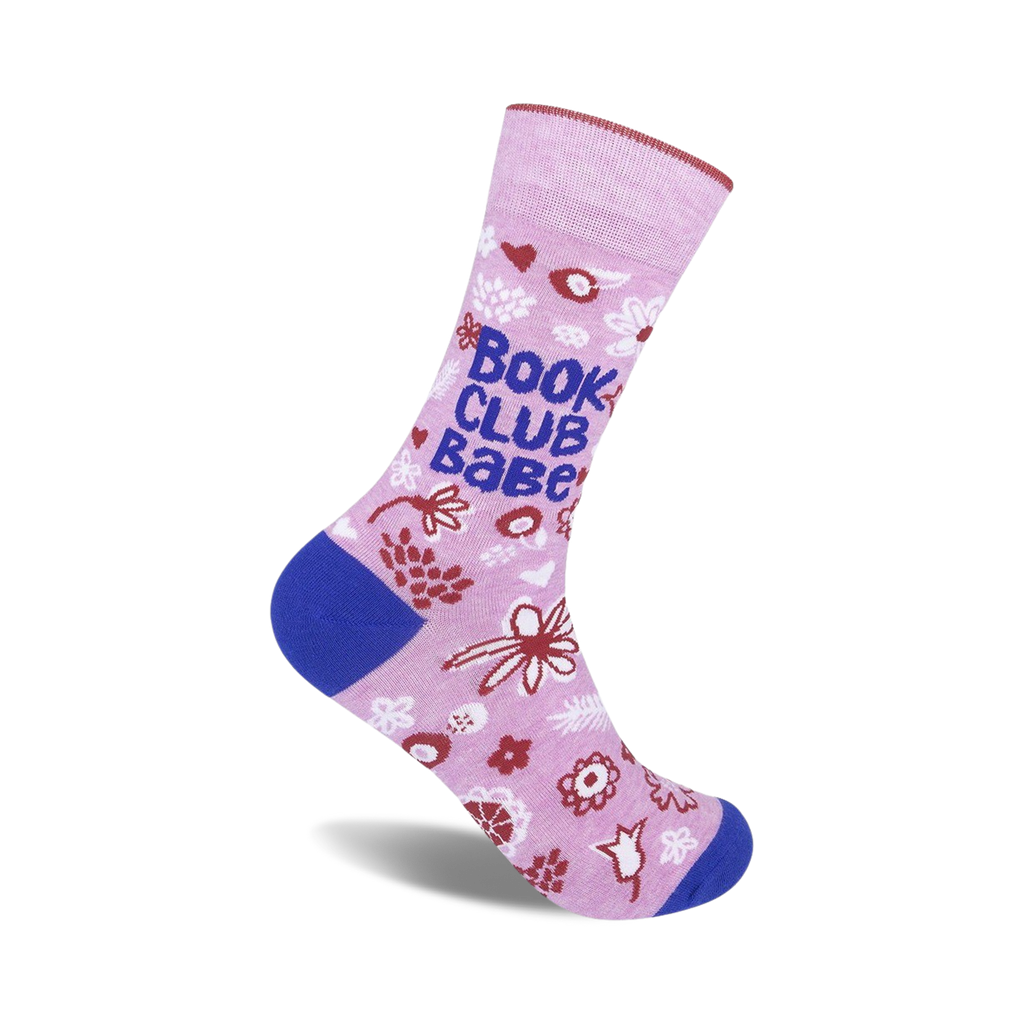 Bright pink socks with blue toes, heels, and cuffs are fabulous for bookworms! With the words "Book Club Babe" adorning the cuff, these book-themed socks also boast a floral print in various shades of pink, yellow, orange, and red with green leaves. Perfect for any literary lover, these socks will make a statement wherever you go!