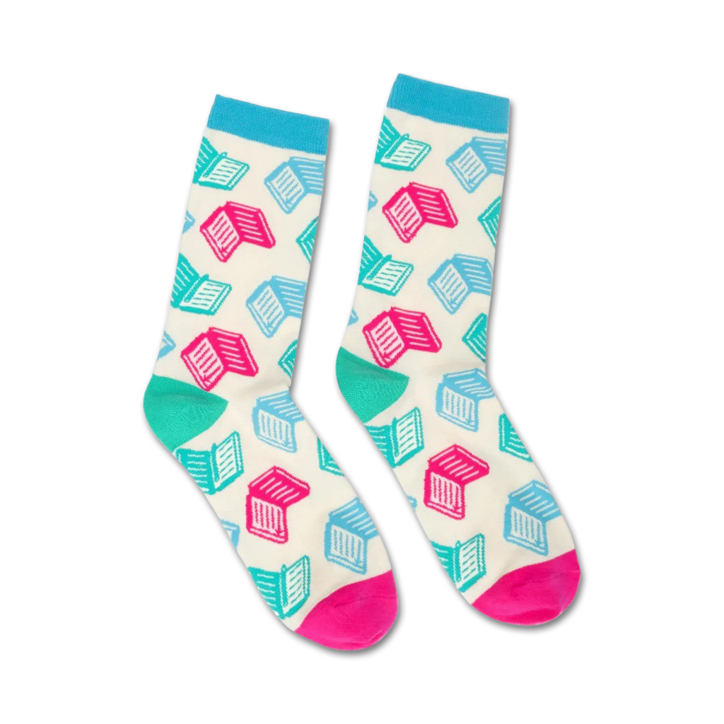 Get your literary toes on with our Books, Books, Books novelty socks! These white crew socks feature a fun pattern of books in pink, blue, and green. Show off your love for reading in style while enjoying the comfort of our soft and durable cotton blend. Whether you're curling up with a good book or hitting the library, these socks will have you feeling like you're stepping into your own personal library.