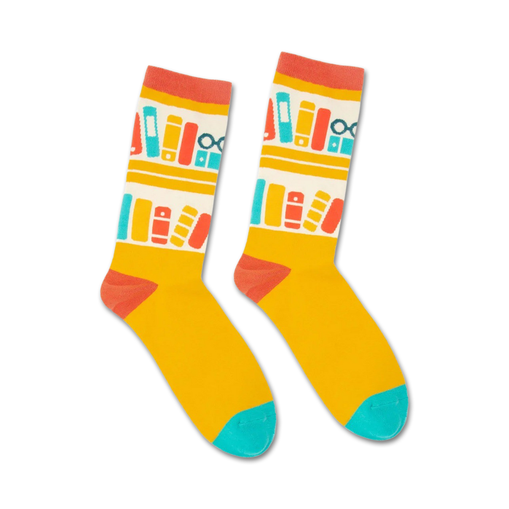 With these bookworm beauties gracing your tootsies, you'll be reading socks appeal! These vibrant yellow socks feature a bookshelf design with books in bright blue, orange and redperfect for when you need a literary lift!