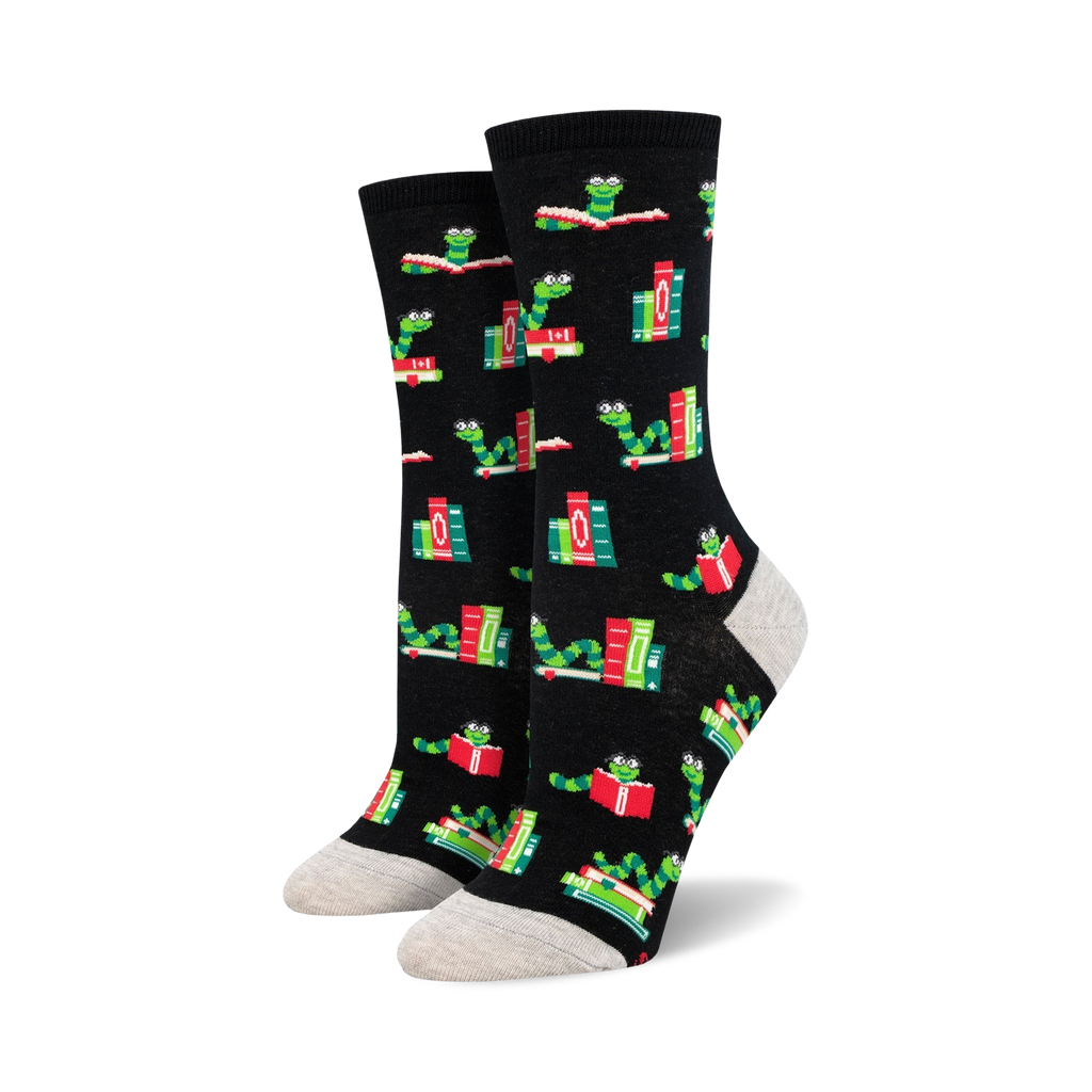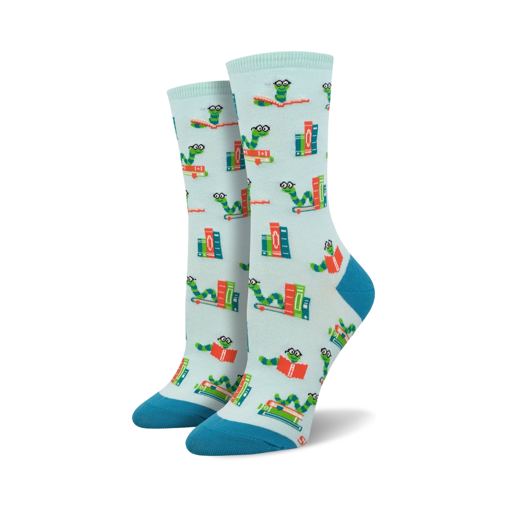 Meet Bookworm crew socks! These light blue socks feature an all-over pattern of cartoonish green worms wearing horn-rimmed glasses and reading books. Show off your love of literacy with these fun and whimsical socks. They're perfect for book club meetings, library visits, or just curling up with a good book. So grab a pair and let the bookworms guide you to your next literary adventure!