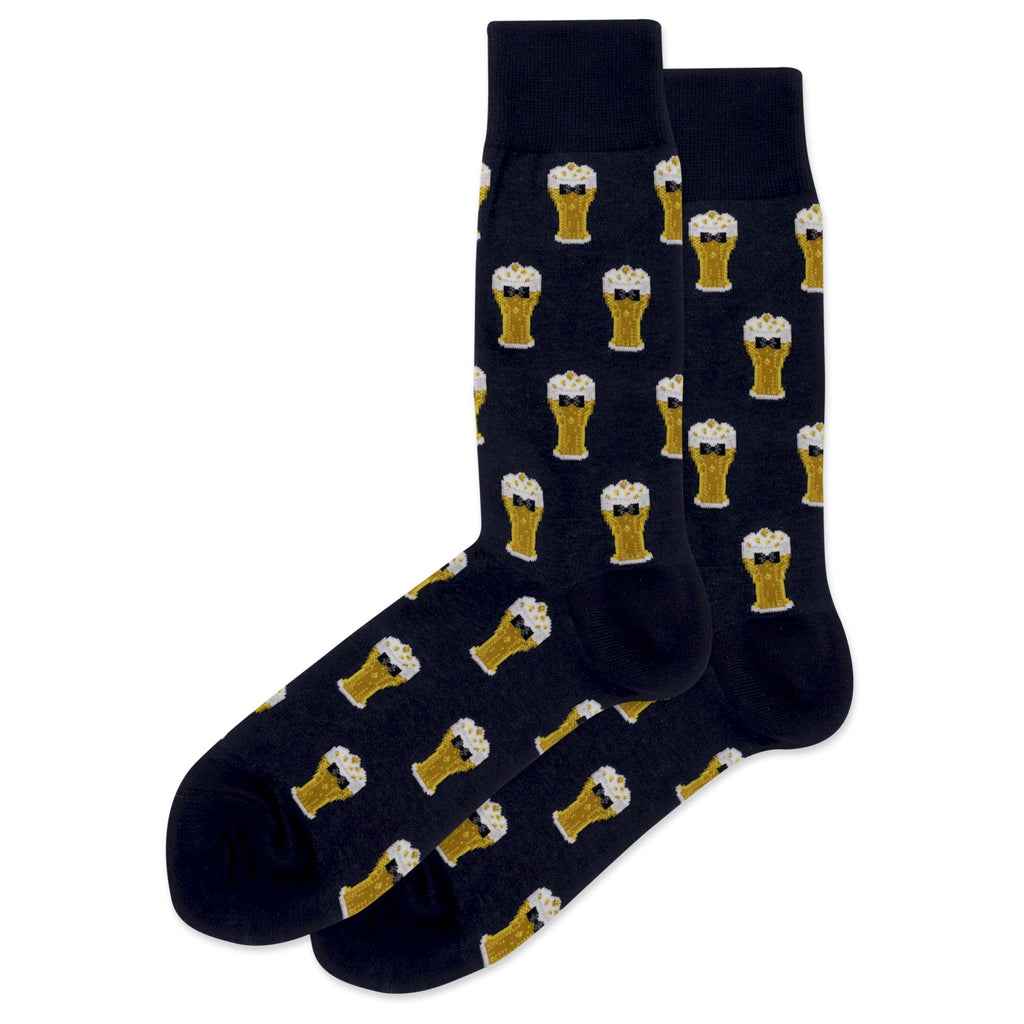 These 'Bow Tie Beer' socks are pretty much exactly what they sound like: dark navy blue socks covered in a pattern of beer glasses. Each glass sports a tiny bow tie. The visible portion shows a repeating design. They're crew socks, with a dark navy cuff shown at the top. Perfect for anyone who appreciates a good brew and a touch of dapper style.