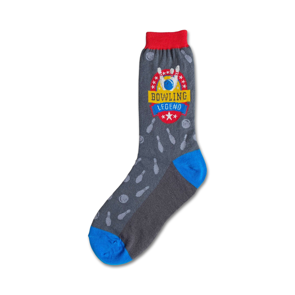 Calling all bowlers and strike enthusiasts! Get ready to roll in style with our Bowling Legend socks. Say goodbye to boring, ordinary foot attire and embrace the thrill of the lanes with these gray crew socks adorned with a vibrant red and blue bowling ball and patriotic red, white, and blue bowling pins. Life's too short to wear boring socks, so step up your sock game and bowl like a pro with our Bowling Legend socks!