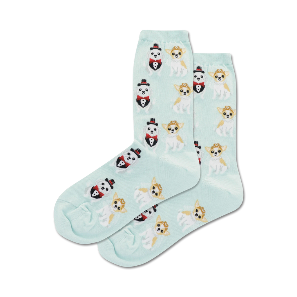 Bridal Dogs Crew Socks: These socks are the perfect way to add a dash of whimsy and joy to any ensemble. With a fun and lighthearted pattern of cartoon dogs dressed to the nines in wedding attire, these socks are sure to turn heads and spark conversations. Put on a pair and show off your playful side while paying a lighthearted homage to those canine companions who've stood by your side through thick and thin.