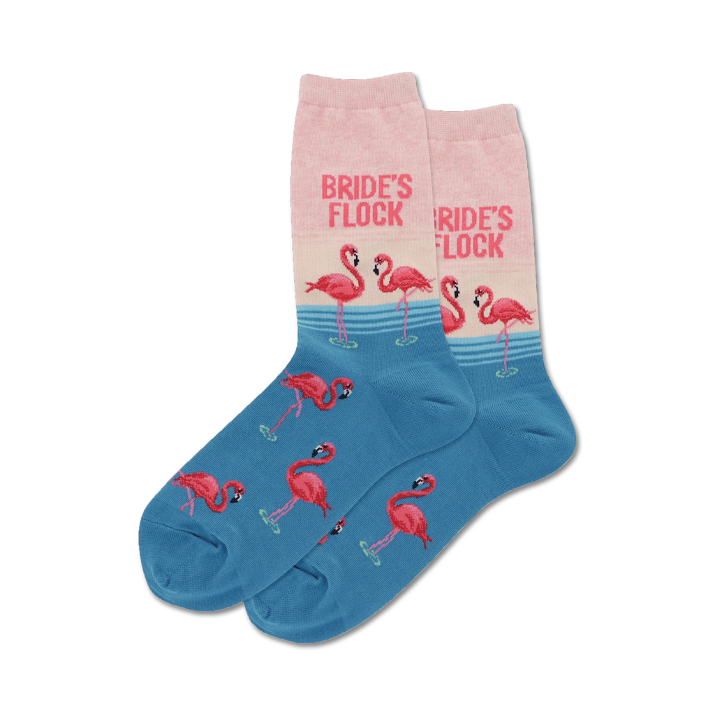 Get ready to flock together in style with these whimsical 'Brides Flock' socks! Featuring a vibrant pattern of pink flamingos and the words 'Brides Flock' and 'Ride's Flock', these crew-length socks are perfect for the fun-loving bride-to-be. Whether you're getting ready for the big day or just want to add a touch of whimsy to your everyday look, these socks are sure to turn heads and bring a smile to your face.