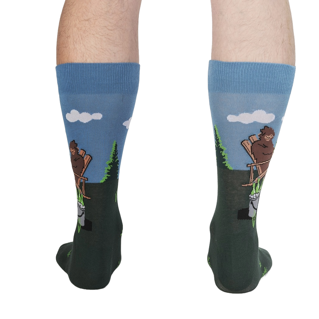 These Bucket List socks are a mythical adventure waiting to happen for your feet. Big Foot is chilling with a couple brewskis and the green grass below is soft and inviting. Get outside!