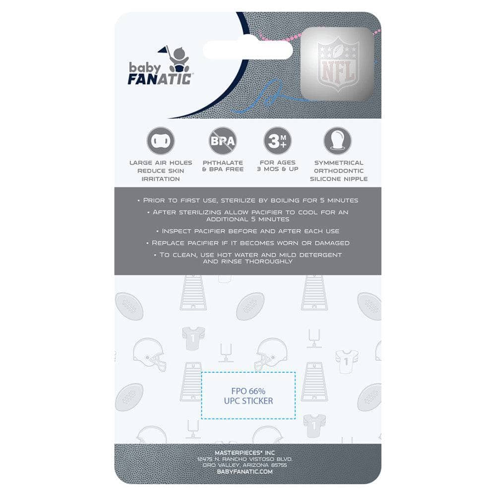 Looking for a way to soothe your little Buffalo Bills fan? Look no further than these officially licensed NFL Buffalo Bills pacifiers. The Orthodontic Silicone Nipple and plastic shield make them safe for your child's mouth, while the Team Logo And Colors on the "button" and shield respectively let everyone know who they're rooting for. These pacifiers have been quality and safety tested to be 100% BPA-free and are suitable for infants ages 3 months and up. To clean, use hot water and mild detergent and rinse thoroughly. WARNING: Do not tie the pacifier around the child's neck as it presents a strangulation danger.
