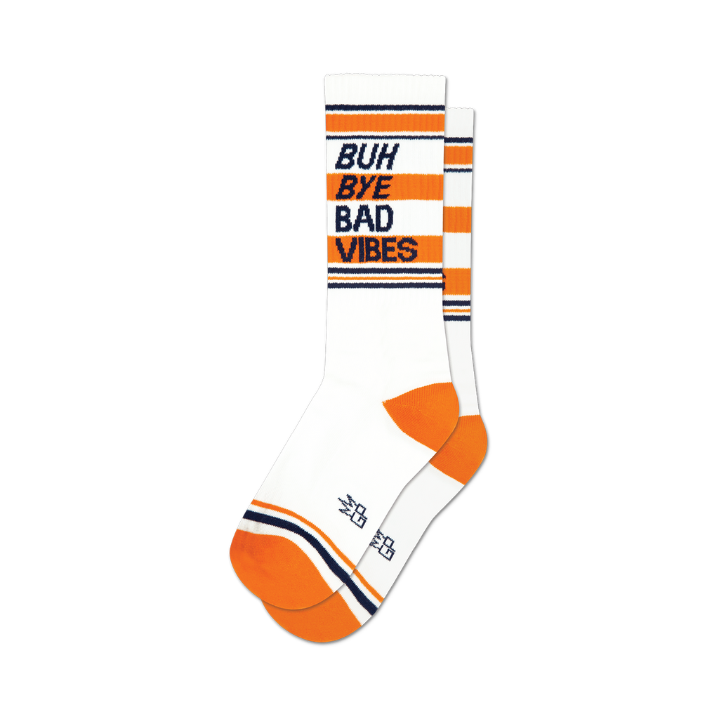 Wave goodbye to negativity with each step in our 'Buh Bye Bad Vibes' socks. Swathed in crisp white with vibrant blue and orange stripes zinging at the top, they are your new secret weapon in turning frowns upside down. Hosting a mood-lifting mantra, these foot-huggers are perfect for lounging, social shindigs, or even those dreary Monday morning meetings. Why not give your feet a splash of cheer and keep the positive pulses flowing all day?