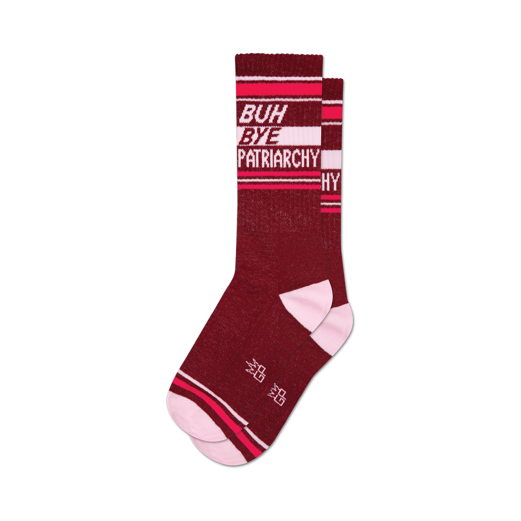 Meet our latest rebellion in fabric form: dark red socks for women, sporting a bold dismissal of outdated norms. Adorned with "Buh Bye Patriarchy" in unapologetic white letters, these socks are more than mere foot coverings—they're a manifesto. Pink toes peek out with a dash of sass, while white stripes add a touch of classic flair. Don these darlings and let every step declare your domain, because why inherit the patriarchy when you can overthrow it in style?