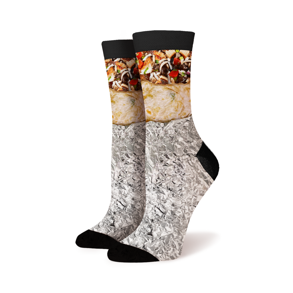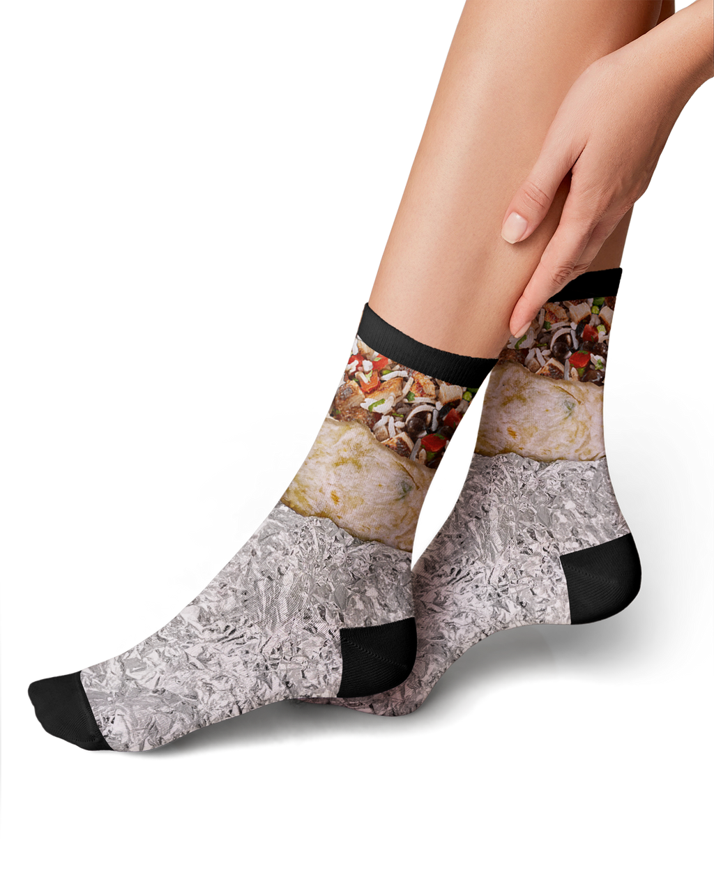 Envision your feet wrapped in a warm embrace of Mexican comfort food... "Burrito 360" socks! Feast your eyes on a repeating pattern of delectable burritos, complete with flour tortillas, black beans, rice, cheese, and veggies. The white socks boast stylish black toes and heels, making them the talk of the town. Let your toes dance inside these crew-length socks as you revel in the joy of burritos ” all without the risk of food stains!