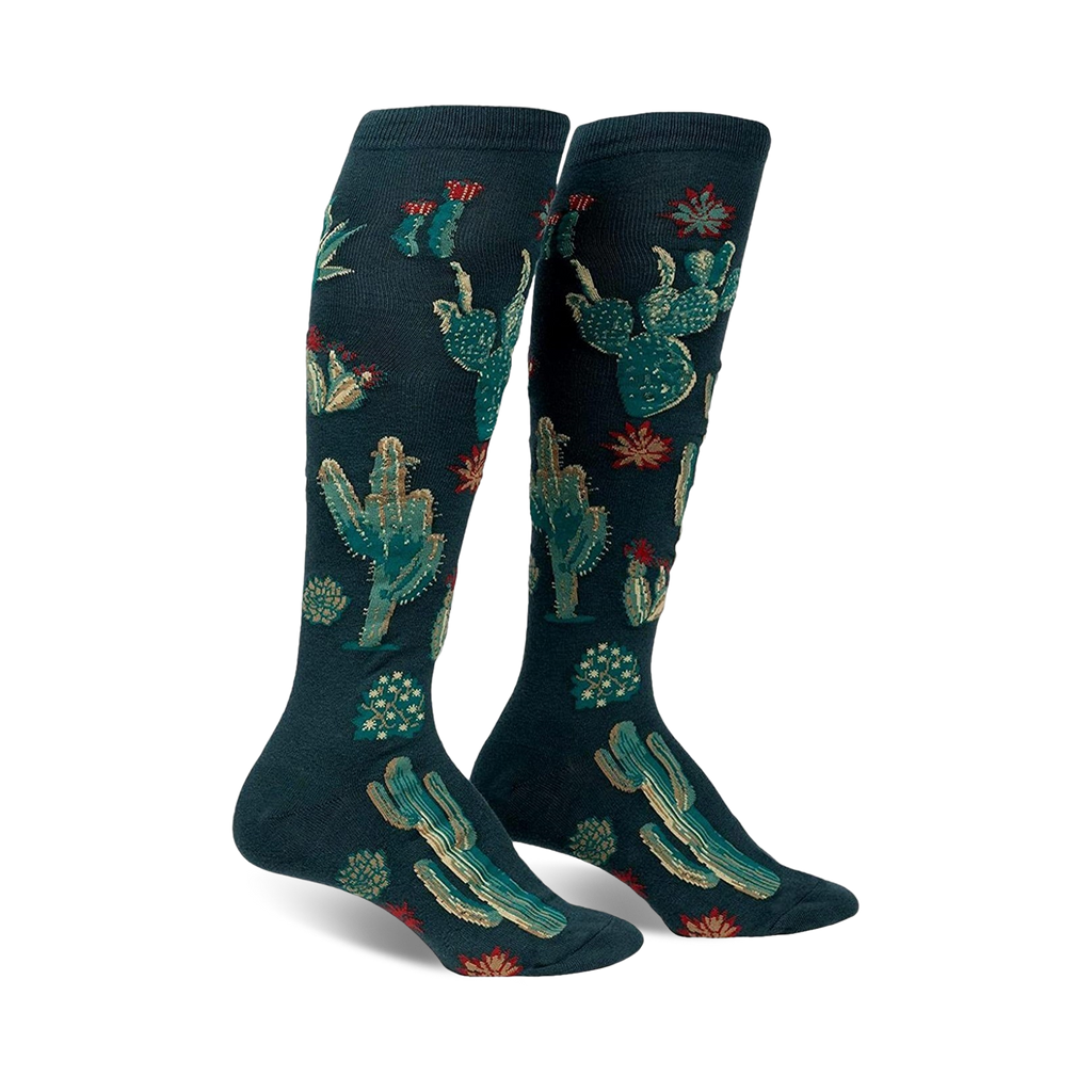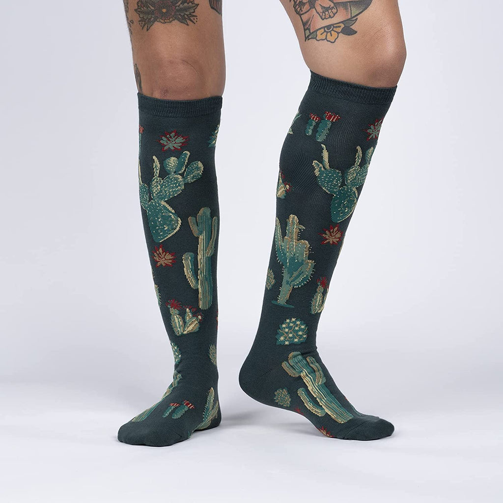 Transport your feet to a lush oasis with the Cactus Jungle knee-high socks! These desert-themed socks flaunt a vibrant display of cacti and flowers, blooming with personality and charm. Adorned in a captivating dark green backdrop, the knee-high design offers both comfort and style. Perfect for women who love nature, sunshine, and a touch of whimsy.