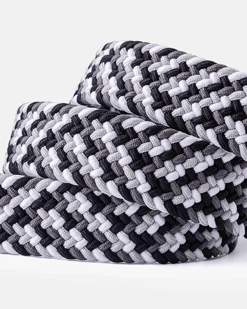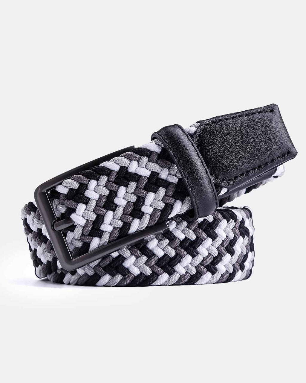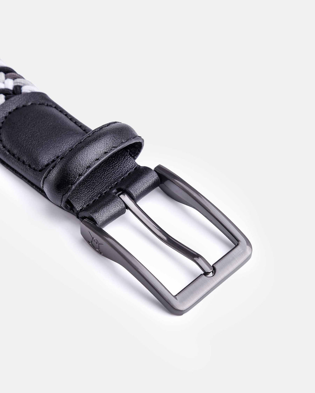 - Black/Grey/Off White Multi Color Belt with Gun Metal Steel Buckle and Black Leather Tail