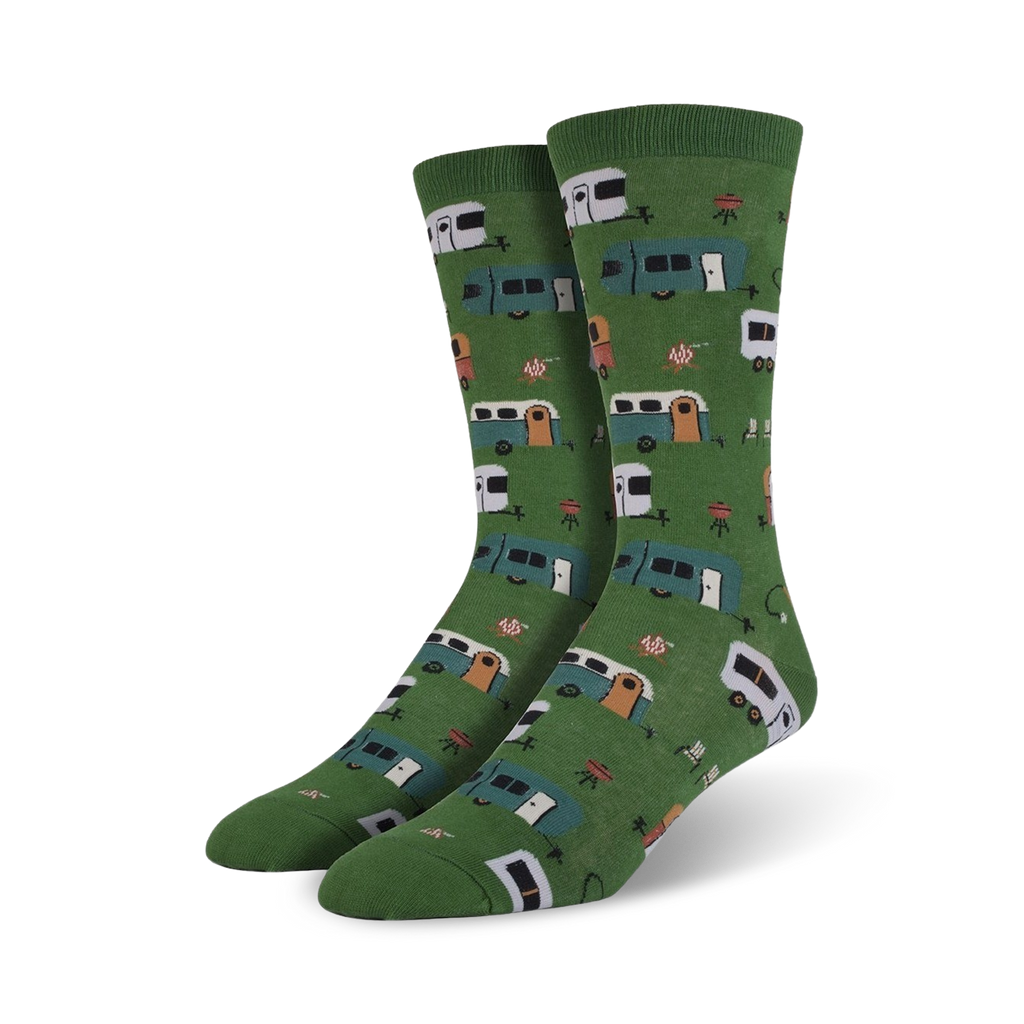 Ready for your next adventure? These Camptown crew socks are covered in retro-style travel trailers, so you can have a little piece of the road, even when you're just chilling at home. Full of vibrant colors, this sock pattern is perfect for anyone who loves to get away from it all. Plus, you'll be sure to get a chuckle from your friends when they see them. So put on a pair of these happy socks and let the good times roll.