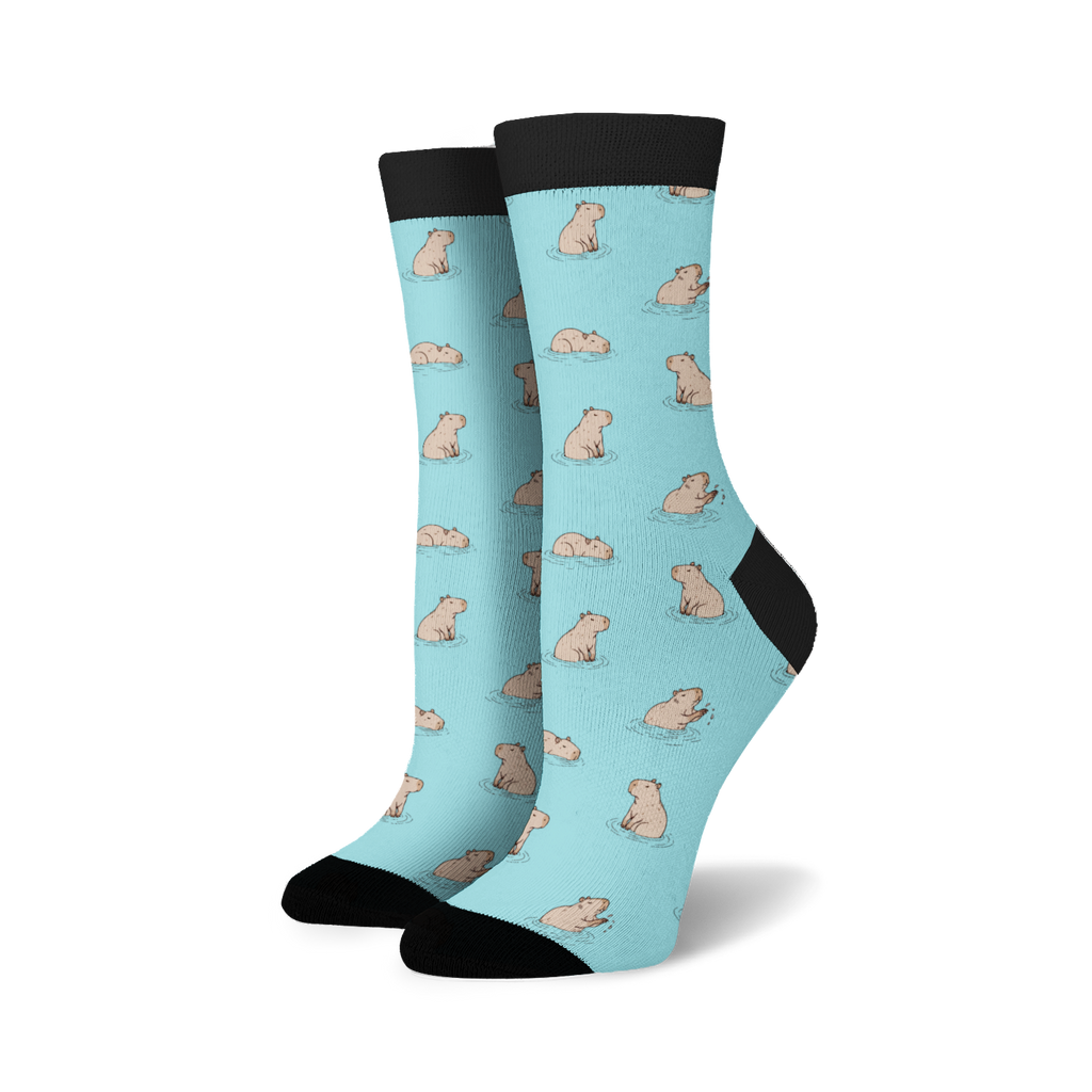 Get ready to dive into cuteness with Capybara Crew Socks! These blue socks are adorned with a pattern of cartoon capybaras swimming in a light blue pond. Capybaras are the world's largest rodents, but don't let their size fool you. They're known for their playful and friendly nature, just like these cozy socks. Available in sizes for both men and women, these socks are the perfect way to add a touch of fun to your everyday wardrobe. Slip into a pair and let the capybaras take you on a whimsical adventure with every step.