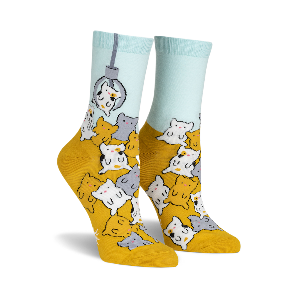 Get your paws on our Cat Claw socks, where fun meets quirky in every step! Featuring a playful pattern of cats snagged by claw grabbers, these socks are a riot of colors against a vibrant yellow backdrop. The light blue cuff adds a pop of cool contrast, making these socks perfect for livening up your daily wardrobe or gifting to your feline-loving friends. Whether you're lounging around the house, jazzing up your work attire, or stepping out for a casual rendezvous, these socks ensure you carry a dose of whimsy wherever you go. Who says you can't have a claw-some day, every day? Grab these socks and let your feet do the talking!