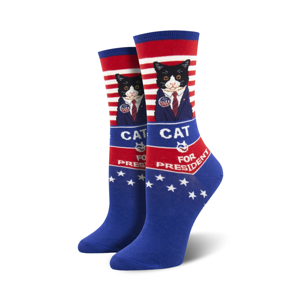You'll be the cat's meow in these stylish crew socks featuring a charming feline in a dashing suit and tie. Cast your vote for fashion with these playful socks and show the world who you're rooting for, even if it's just your cat.