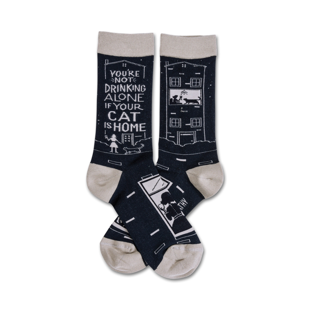 Calling all cool cats and curious kittens! Get your paws on our Cat Is Home socks ”where the party never ends. You'll never have to drink alone again as long as your furry friend is by your side, and these socks prove it! With a black backdrop, adorned by a white picture-perfect house and a cat looking out the window, these socks will keep you cozy and stylish. Order yours and meow!