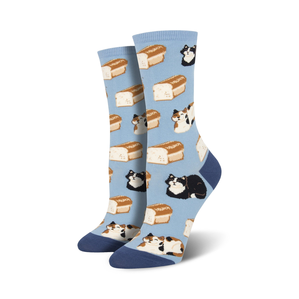 Loafing through life? Cat napping the day away? Then these Cat Loaf crew socks are perfect for you. Snooze the day away in these cozy, light blue socks with a pattern of sleeping cartoon cats nestled on slices of bread. Whether you're up early catching worms or curled up on the couch, the cats on these socks will inspire you to embrace your inner feline.