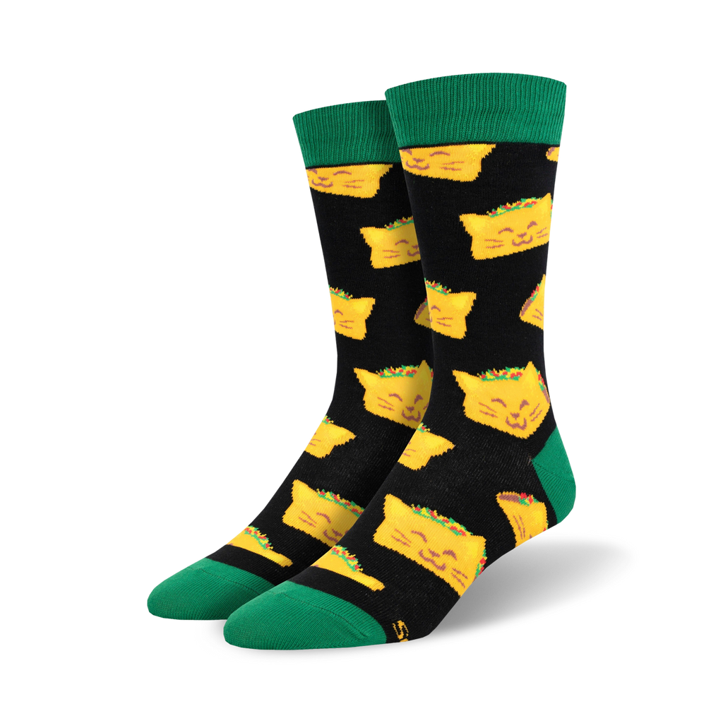 Savor the flavor of Cat Tacos with these knee-slapping socks featuring cartoon cats sporting hard taco shells on their heads. Giving a whole new meaning to "the cat's meow, " these feline tacos are sure to spice up your feet and tickle your funny bone. For when the purrfect snack calls, Cat Tacos answer! Meow!