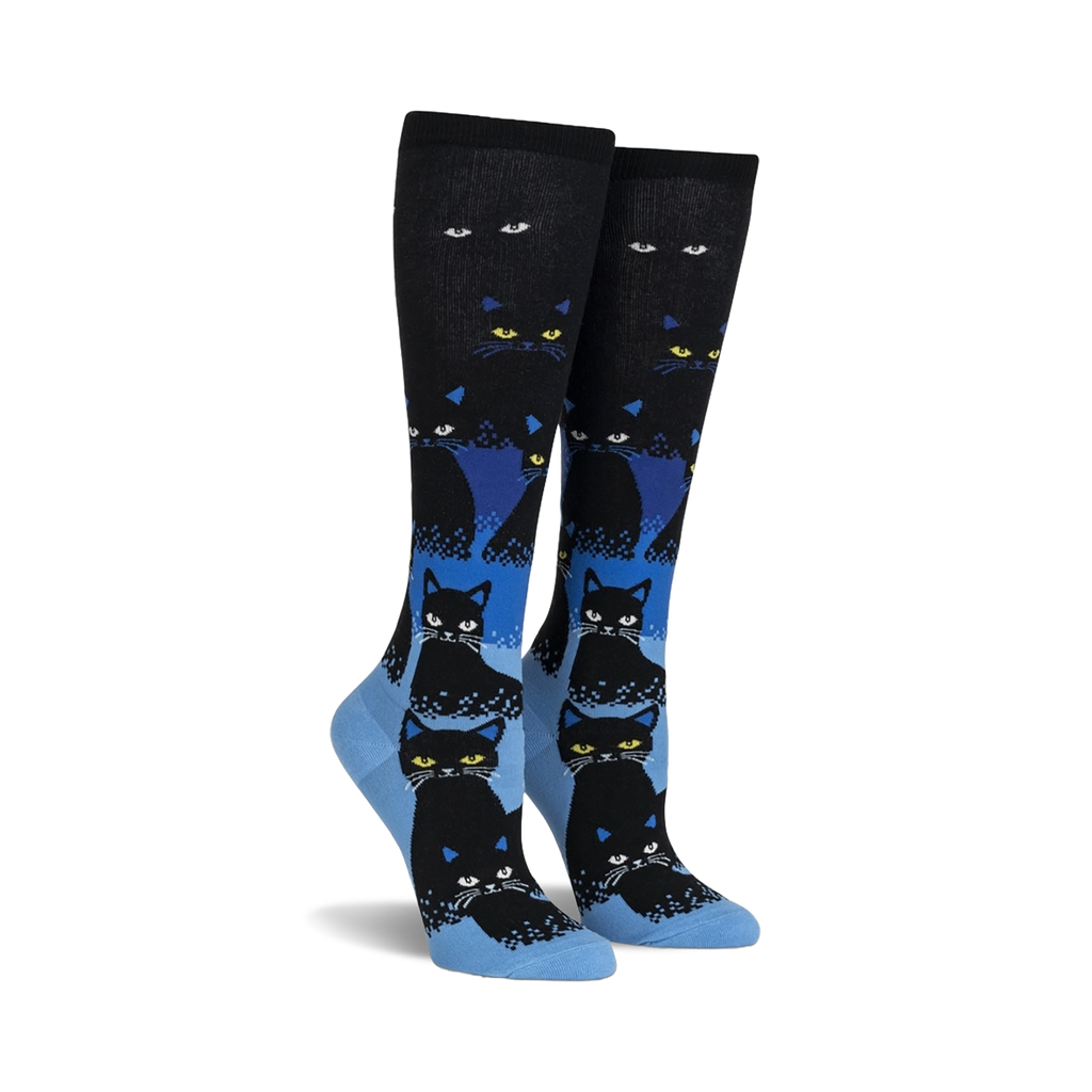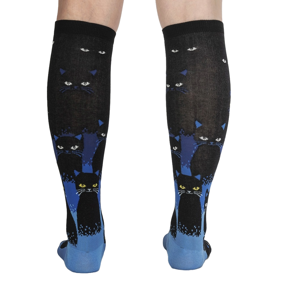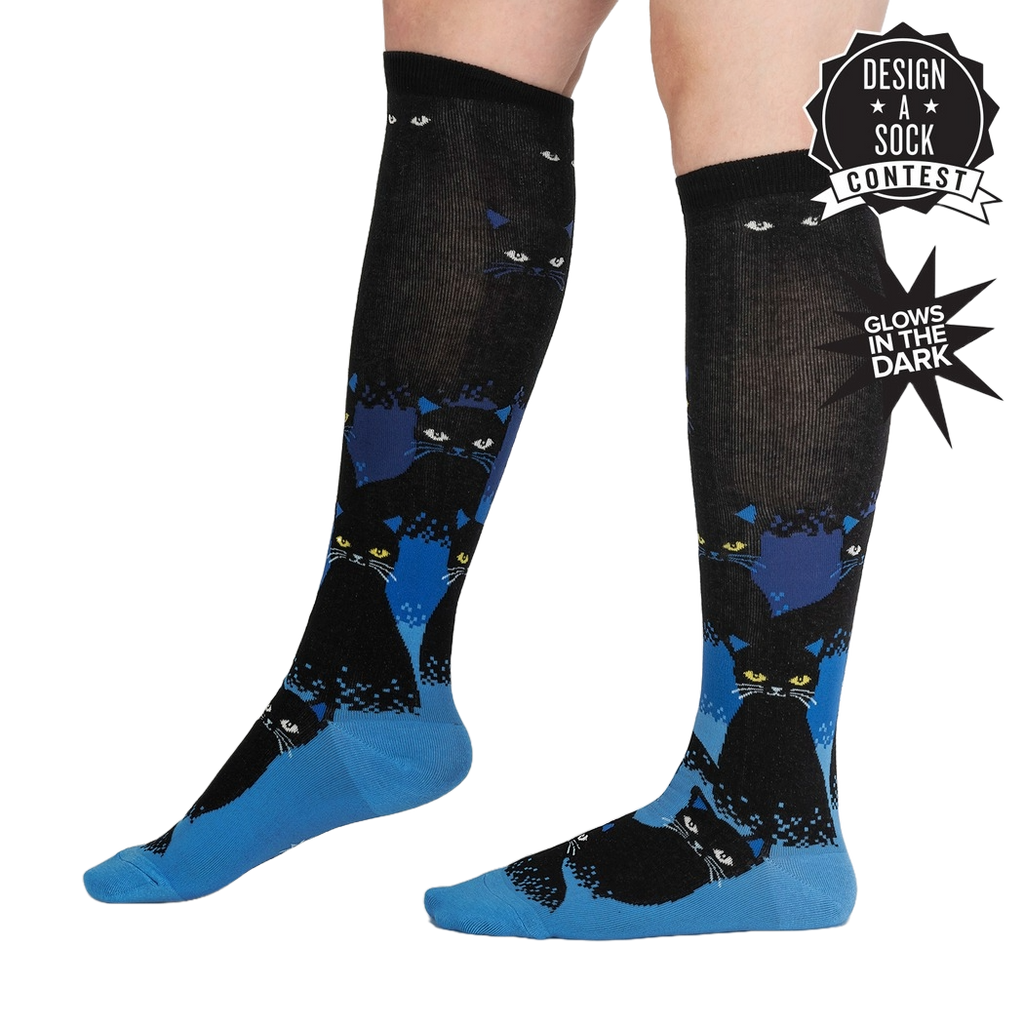Calling all cat lovers! Step into the spotlight with our knee-high glow-in-the-dark socks adorned with a grid of quirky cartoon cats. These playful socks will have you shining bright like a feline superstar, even in the darkest of nights. Warning: Prepare for an overload of cuteness and compliments wherever you go!