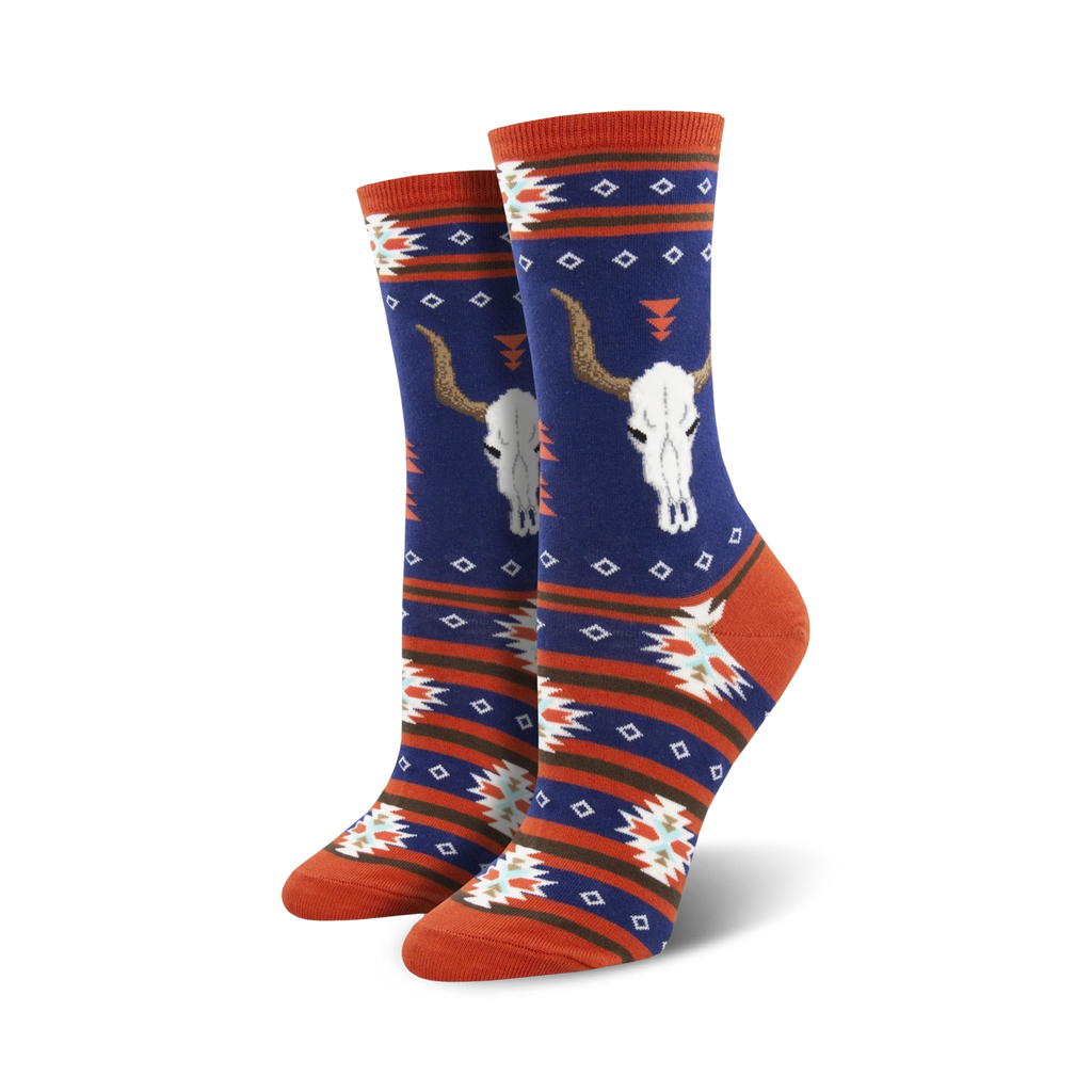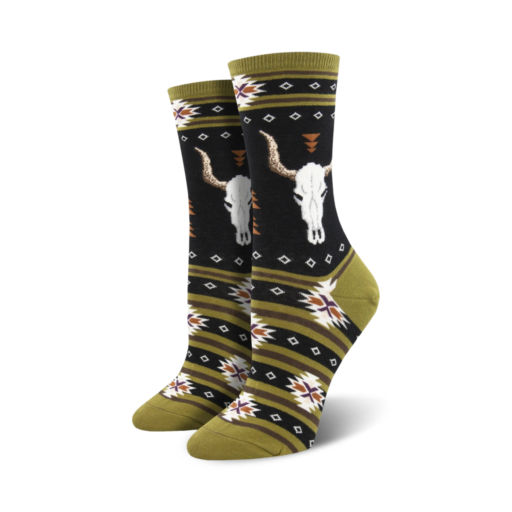 Channel your inner cowgirl or cowboy with these Cattle Call socks. The black, olive green, brown, and cream colors are a nod to the vast vistas of the Wild West, while the geometric patterns and steer skull motifs give them a playful, whimsical twist. In these crew length socks, you'll be rootin', tootin', and boot scootin your way through your day with a smile on your face.