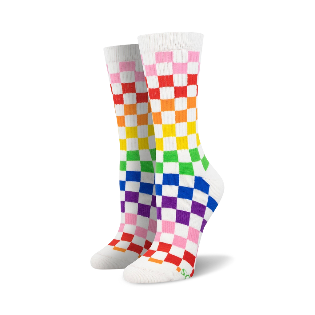 Check Out Your Stepping Stones - Our Check Me Out socks are your passport to the rainbow - white background, rainbow-colored checkerboard, red, orange, yellow, green, blue, purple. They believe that there's no place like home so you'll always find your way home in these crew socks.