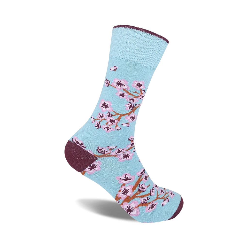 Spring is in the air with these cherry blossom socks! The light blue fabric comes to life with a pattern of blooming pink blossoms and twisting brown branches. Crew length and made for women, these socks are as captivating as the cherry blossoms themselves, and with five petals on each flower, a certain Disney princess would surely approve.