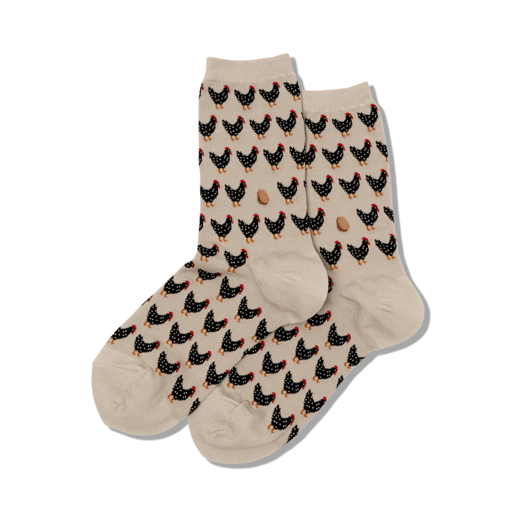 Fall in love with these quirky Chicken and Egg crew socks! Adorned with a whimsical pattern of chic black chickens with fiery red combs and feet strutting across a beige backdrop, these socks are sure to add a touch of fun and cheer to any autumn outfit. Plus, the playful pattern of tiny brown eggs hidden in the design makes these socks even more charming.