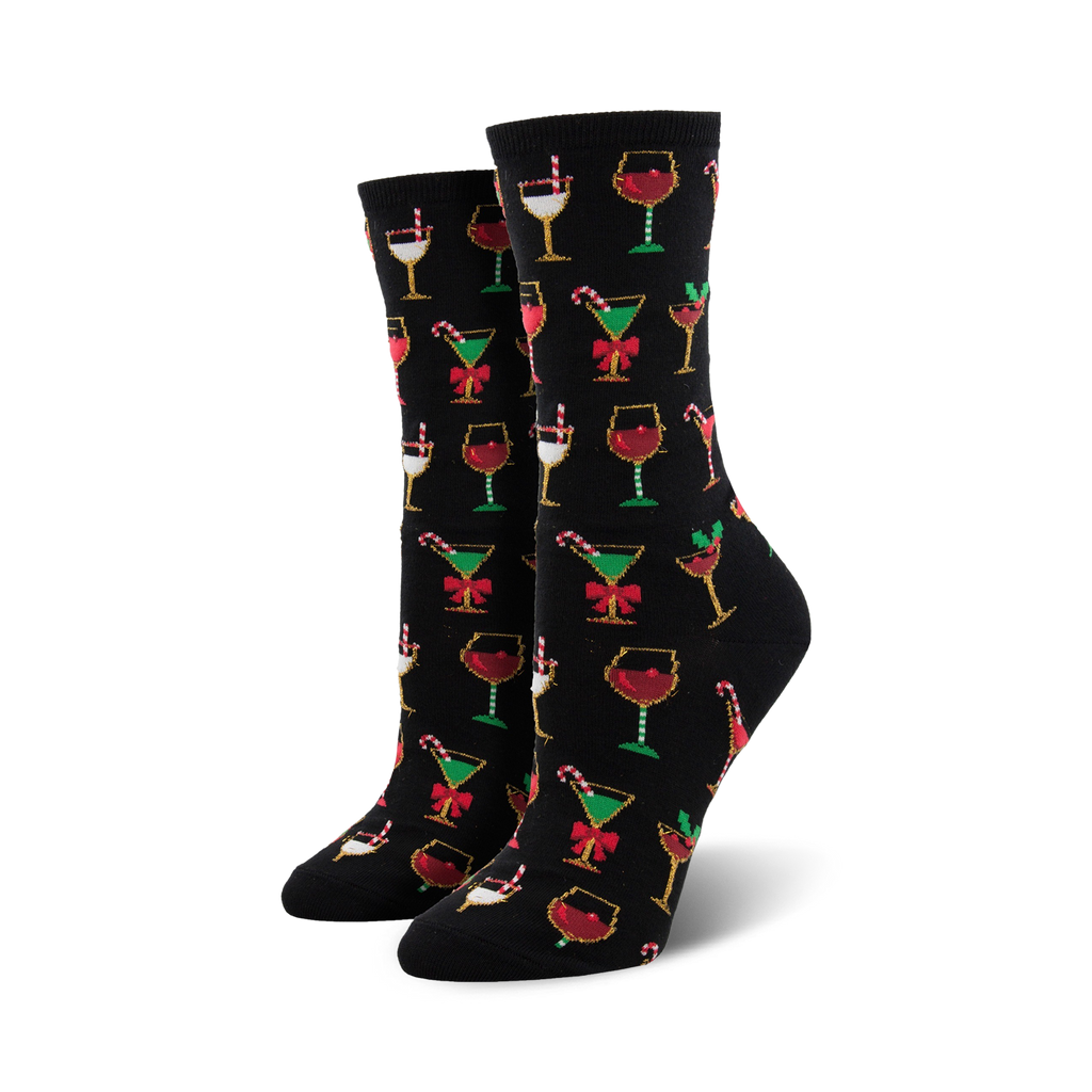These 'Christmas Cocktails' socks are a festive treat for your feet. The shown portion features a black background with a repeating pattern of colorful cocktail glasses. There are wine glasses, martini glasses, and what looks like a creamy cocktail, all decorated with candy canes and bows. The visible colors are primarily red, green, and gold against the black. They're crew socks, and seem like they'd be super comfy.
