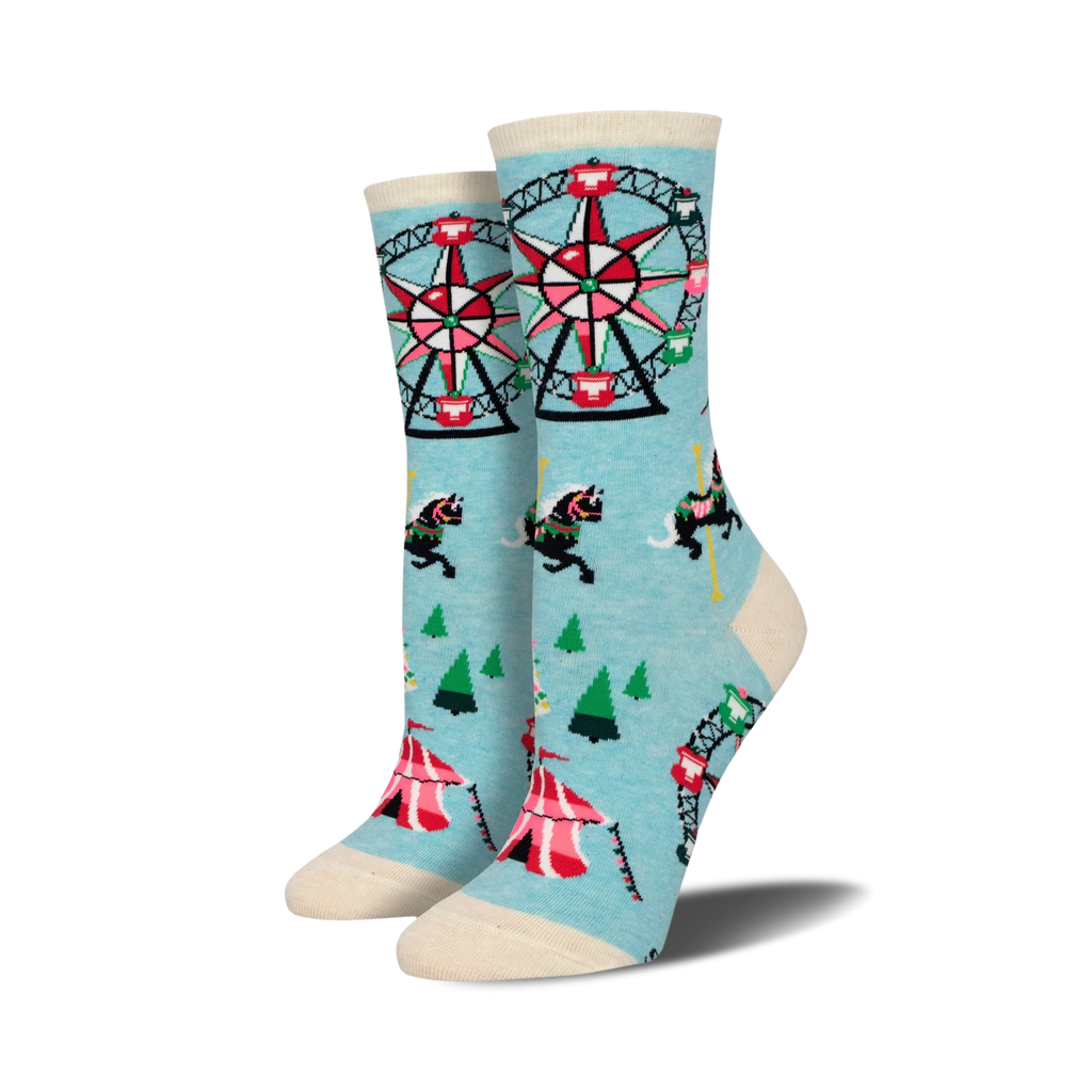 Christmas Fair Womens Crew Socks are festive, jolly, and ready to brighten up your day! These blue socks feature a colorful pattern that will definitely make you feel merry and bright. Carousel horses, Christmas trees, and presents will have you feeling the Christmas spirit from head to toe. It's like wearing a tiny, festive party on your feet. These socks are the perfect addition to any holiday outfit, and they're sure to put a smile on your face every time you wear them.