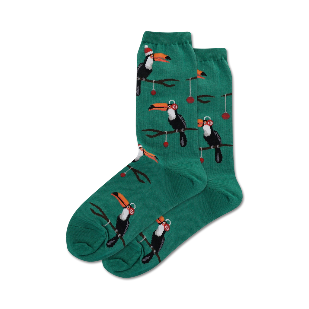 Calling all Christmas enthusiasts! Set your toes free with our "Christmas Toucans" socks! Picture this: toucans decked in jolly Santa hats, perched on festive branches adorned with crimson berries, and all of it painted in merry shades of green. These crew-length socks for women are here to remind you that Christmas cheer comes in all shapes and sizes, just like these adorable toucans. Embrace the holiday spirit, one sock at a time!
