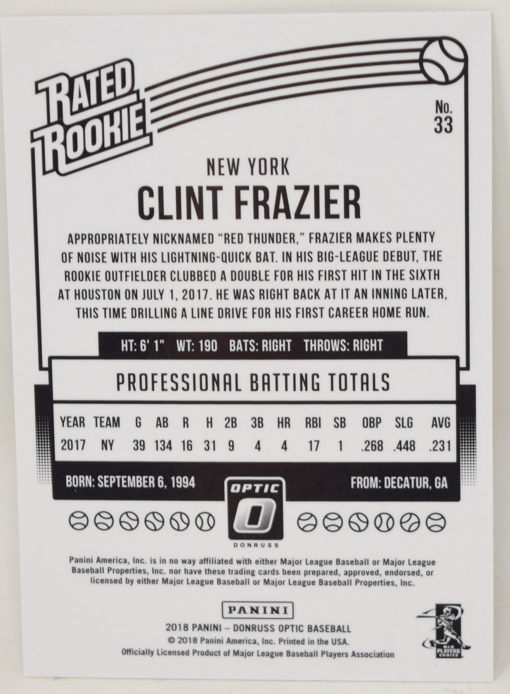 Clint Frazier Donruss Optic 2018 Baseball Card Rookie RC 33 NM