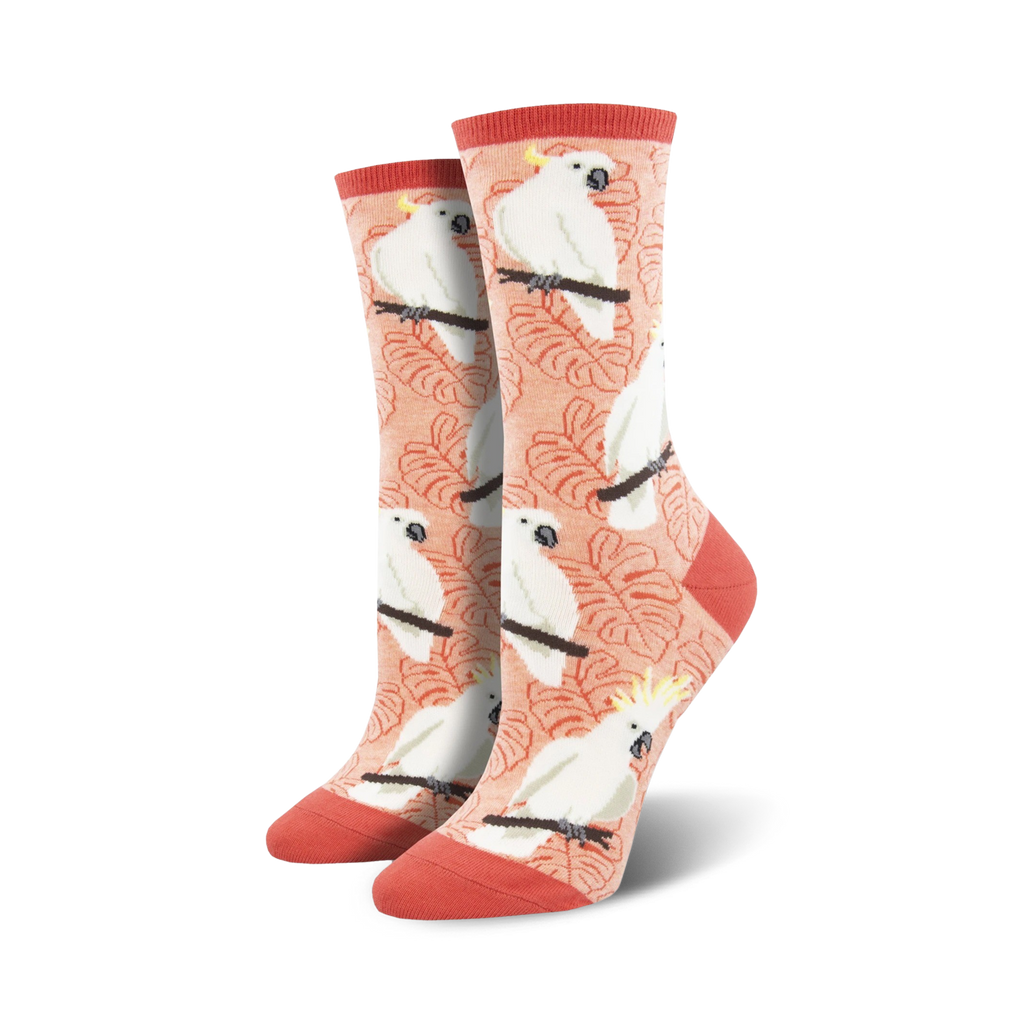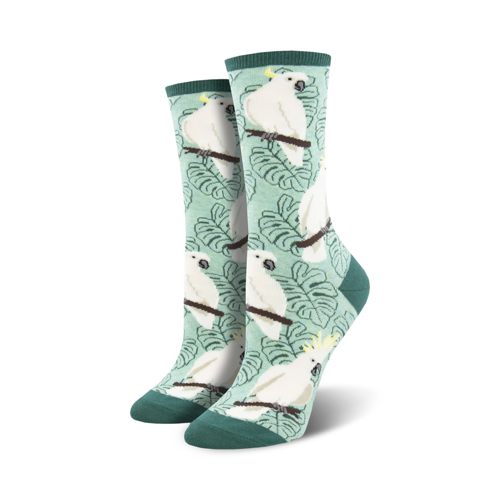 Embrace the vibrant energy of the cockatoo with these delightful crew socks designed exclusively for women. Featuring a captivating pattern of these playful and striking birds perched amidst lush green leaves, these socks are a veritable aviary of charm. From the bold yellow crest to the soft pink cheeks of the cockatoos, every detail is rendered with exquisite precision. Prepare to have your spirits lifted and your feet pampered as you step into a world of feathery whimsy!