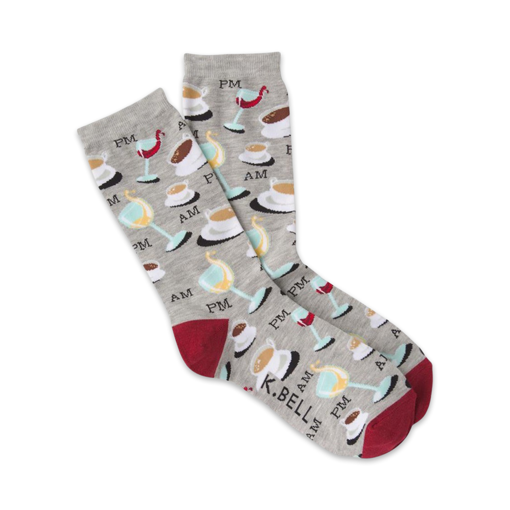 Looking for a fun way to add some caffeine and vino to your sock drawer? Slip into our Coffee And Wine socks and let the morning brew and evening pour fuel your feet all day long! With their gray backdrop, eye-catching pattern of white coffee cups filled with black coffee and red wine glasses filled with white wine, red toes and heels, these crew-length socks will have you daydreaming of your next coffee break or wine night. Plus, they're made just for women, so you can feel fabulous while you sip and savor.