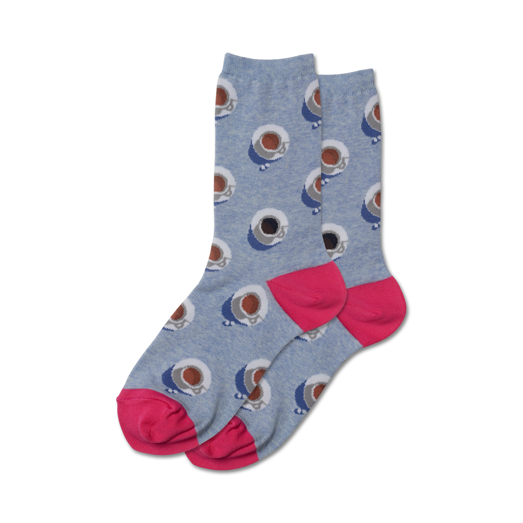 Show off your love for the 'cup' that cheers with our Coffee Cups Novelty Socks. Whether you're a barista, coffee connoisseur, or just love the smell of fresh brewed beans, these stylish socks will tickle your fancy. The socks are a vibrant light blue adorned with a pattern of steaming coffee cups in rich brown and white shades, featuring a dark blue cuff and toe for a pop of contrast. Grab a pair of these coffee-inspired socks and let them brew up some fun in your wardrobe.