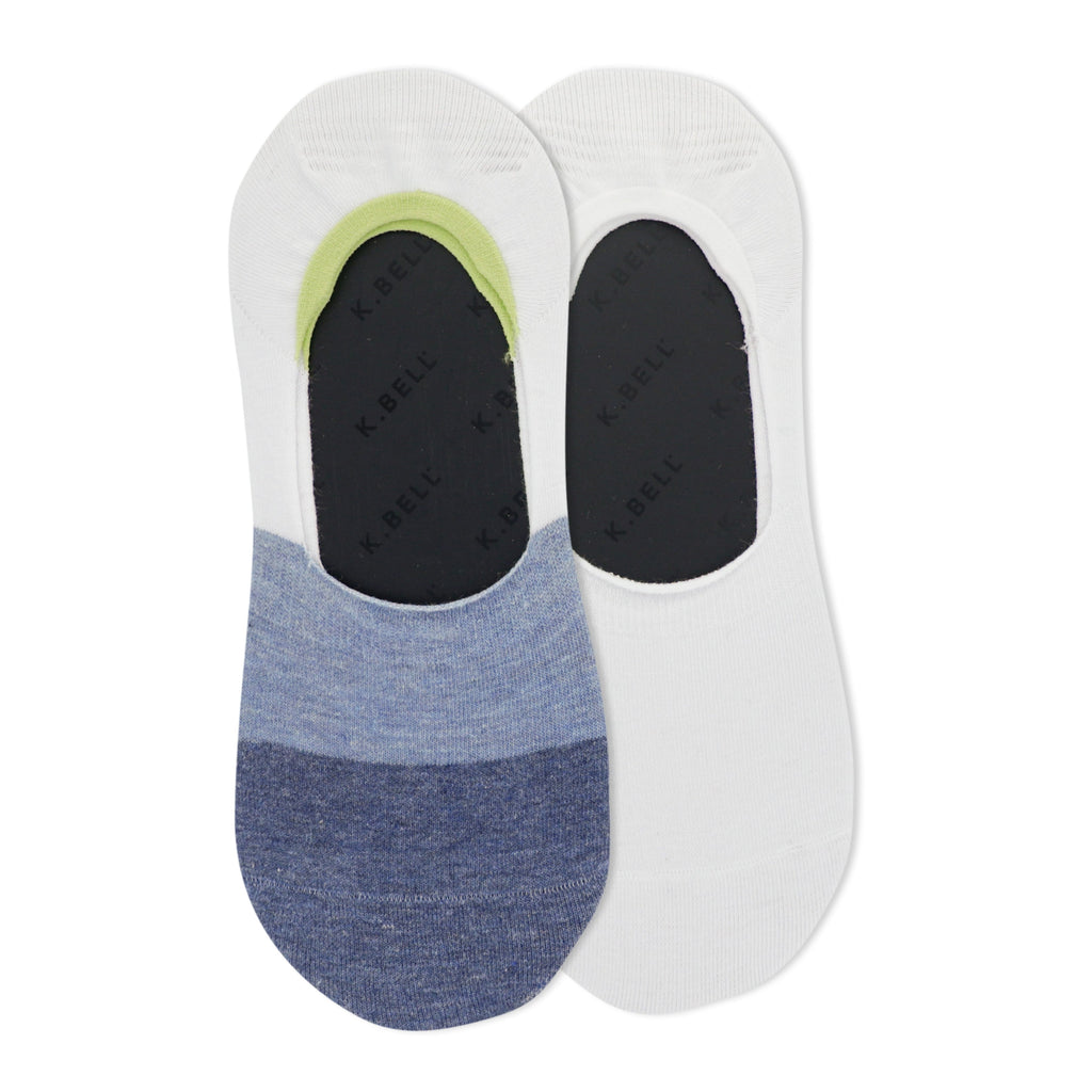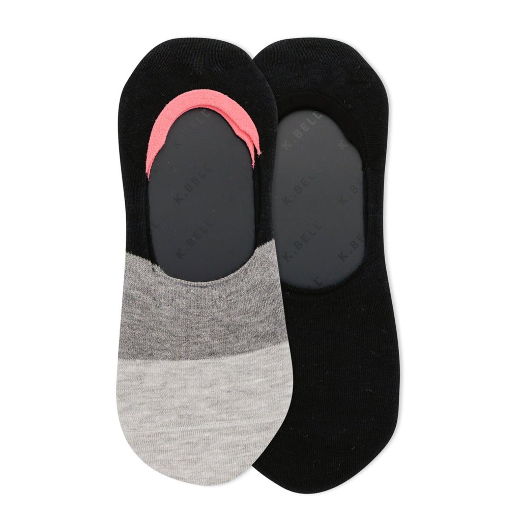 These Colorblock no-show socks are a simple way to add a pop to your shoe game. One pair shown has a black-grey-and-coral colorblock design, while the other pair features a white-and-denim blue colorblock. The visible parts of the socks have a horizontal stripe pattern. The inside of the sock, as seen in the image, is dark-colored with a logo repeated. They're comfortable, and the no-show style means they're perfect for slipping into shoes without showing. A nice little style detail that's easy to wear.