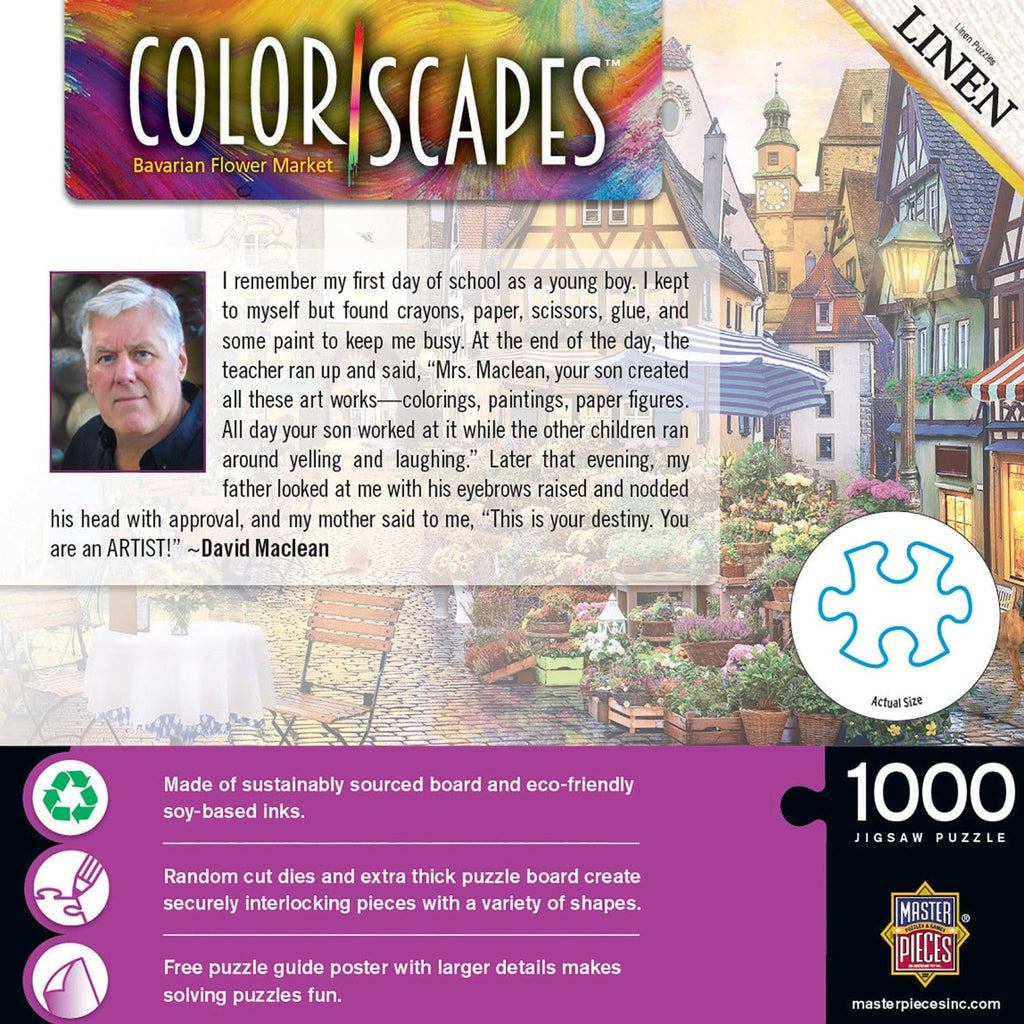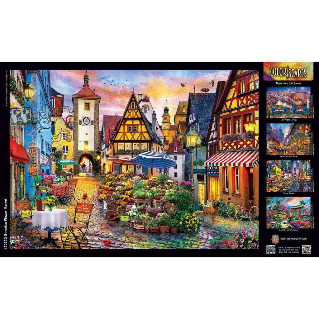This MasterPieces 19.25" x 26.75" 1000pc Colorscapes Puzzle. The tiny Bavarian town wakes up as the flower market opens. This puzzle is made of linen To reduce their impact on our environment, the chipboard used in these puzzles is made of 100% recycled material.