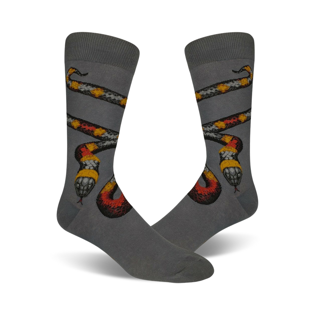 In the world of socks, boring is yesterday's news. Step into the wild side with our Coral Snake Crew Socks! These bad boys are as bold and vibrant as the snakes they're named after. Picture this snake sock: a slithering pattern of red, yellow, and black, wrapped around your feet in all its fierce glory. Made for men with a taste for the unconventional, these socks don't just protect your feet, they make a statement. Wear them to your next party and watch heads turn. Just don't be surprised if you start getting snake-related compliments!