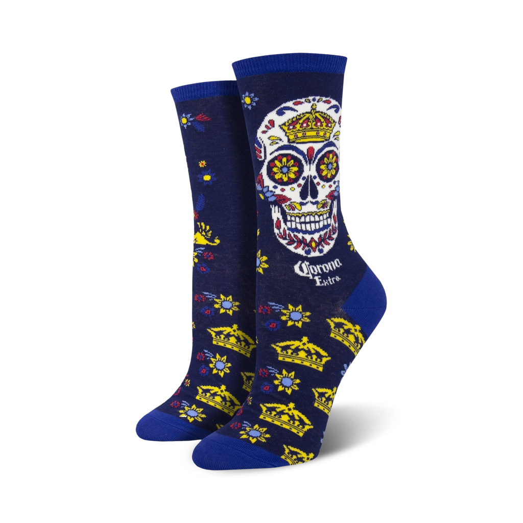 Prepare to have a skull-cracking good time with our Corona Muertos socks! Featuring a vibrant pattern of blooming gold crowns and colorful flowers, these socks will make your feet the center of attention at any Day of the Dead celebration or casual gathering. Each sock showcases a regal skull adorned with a golden crown, adding a touch of elegance to your undead look. Embrace the beauty of life and death with these crew-length socks designed to bring joy to your sole. Step into a world of vibrant colors and intricate designs with our Corona Muertos socks ” the perfect blend of lighthearted fun and morbid fascination.