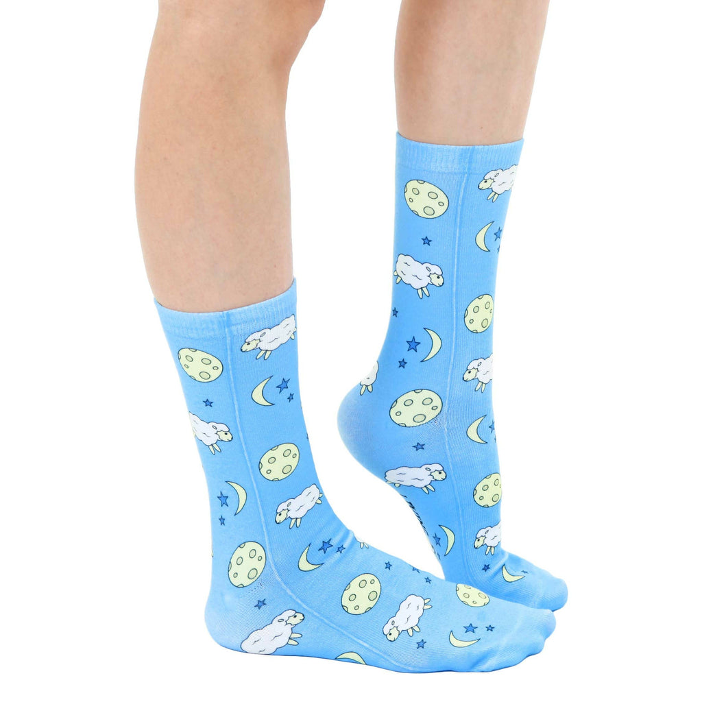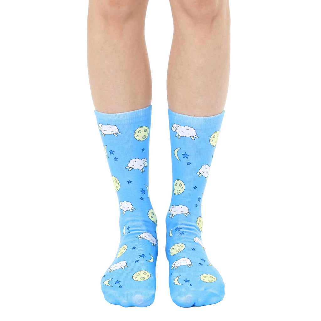 Yep, they're just socks, but these blue Counting Sheep crew socks for women are the GOAT! With a dreamy pattern of fluffy white clouds, sheep, and shiny yellow crescent moons, these soft socks are real cloud-nines for your toes, even during the wool-iest of days. What's that you say? They're the best socks ever? Baaa-lieve it!