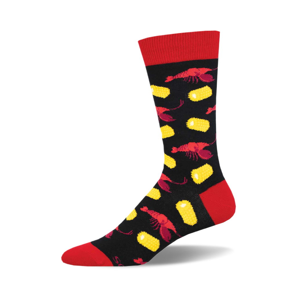 Wrapped in a bold pattern of lobsters and corn on the cob, these black crew socks with striking red accents at the cuffs, toes, and heels are your secret ingredient to making any ensemble pop. Whether you're shuffling around the house or strutting through a seafood fest, our socks are sure to catch eyes and start smiles. Perfect for those who like their style served with a side of fun!