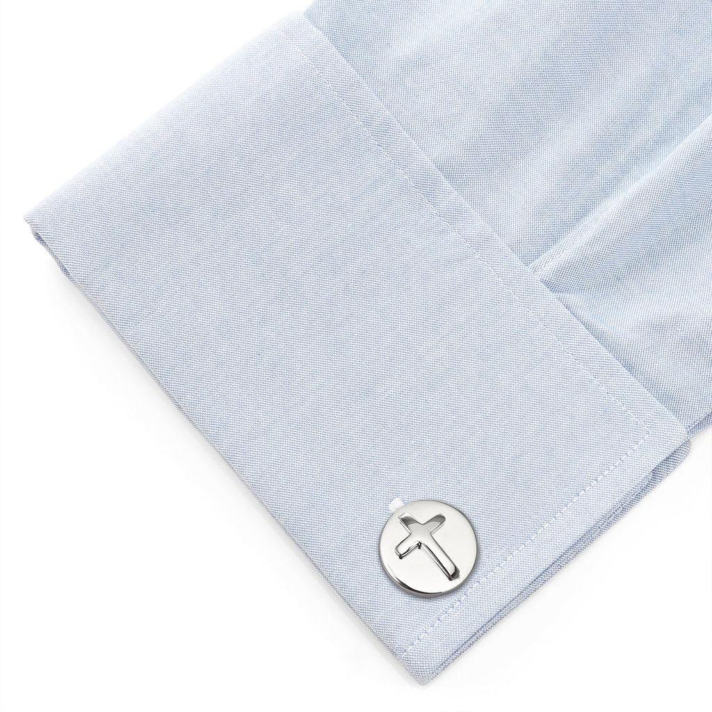 A Christian cross appliqué sits atop a polished circle base on these stainless steel cufflinks, turning a simple design into a classic look you'll want to wear again and again. We've paired them with our bestselling coordinating tie clip, featuring an elegant cross cutout, to create the perfect gift set. Includes branded gift box.
