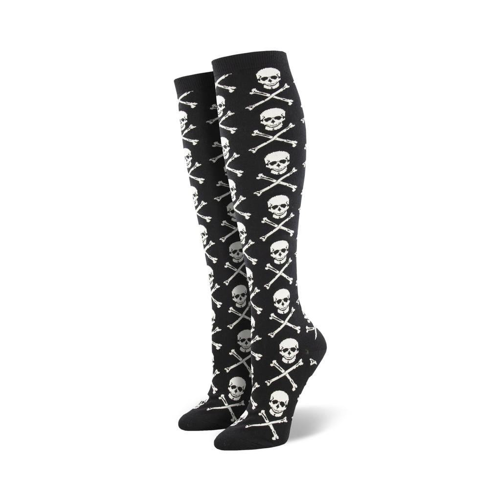 Trick or feet! Show your Halloween spirit with our Crossbones Knee High Socks. Rock a pair of these socks to liven up your Halloween costume, or just to add some spooky fun to your everyday look. With a bold pattern of white skulls and crossbones on a black background, these socks are sure to turn heads wherever you go. They're made with a comfortable cotton blend that will keep your feet happy all day long. Whether you're trick-or-treating, partying, or just hanging out, these socks are the perfect way to add some spooky style to your outfit.
