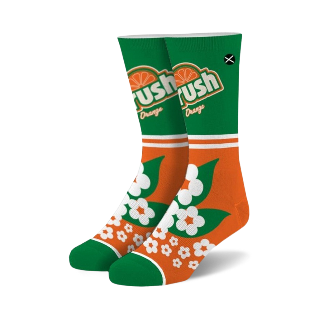 Zesty, vibrant, and sweet as an orange Crush! These socks will have you rockin' that sock game with their brilliant green and orange stripes and eye-catching white flower patterns. They'll leave you feeling just peachy, no matter the occasion. And remember, with each step, you're also spreading the word about the importance of crushing orange. Let your feet do the talking and always be ready for that #OrangeCrush. Oh, and they spell out the word "orange" in giant green letters how cool is that?
