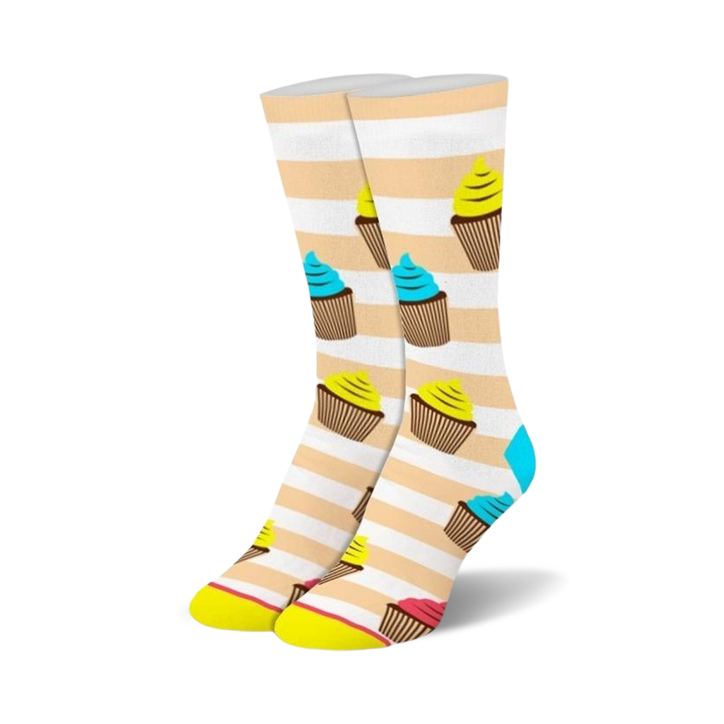 Introducing Cup Cakes socks, the sweetest novelty socks that will leave you craving more! These white socks with light brown stripes are adorned with an adorable pattern of yellow cupcakes with blue or pink frosting. Whether you're a baker, a cupcake enthusiast, or just someone who loves fun socks, these Cup Cakes socks are sure to bring a smile to your face. Plus, with their crew length, these socks will keep your feet cozy and comfortable all day long. These Cup Cakes socks are the perfect gift for any occasion, so treat yourself or a friend to a pair today!