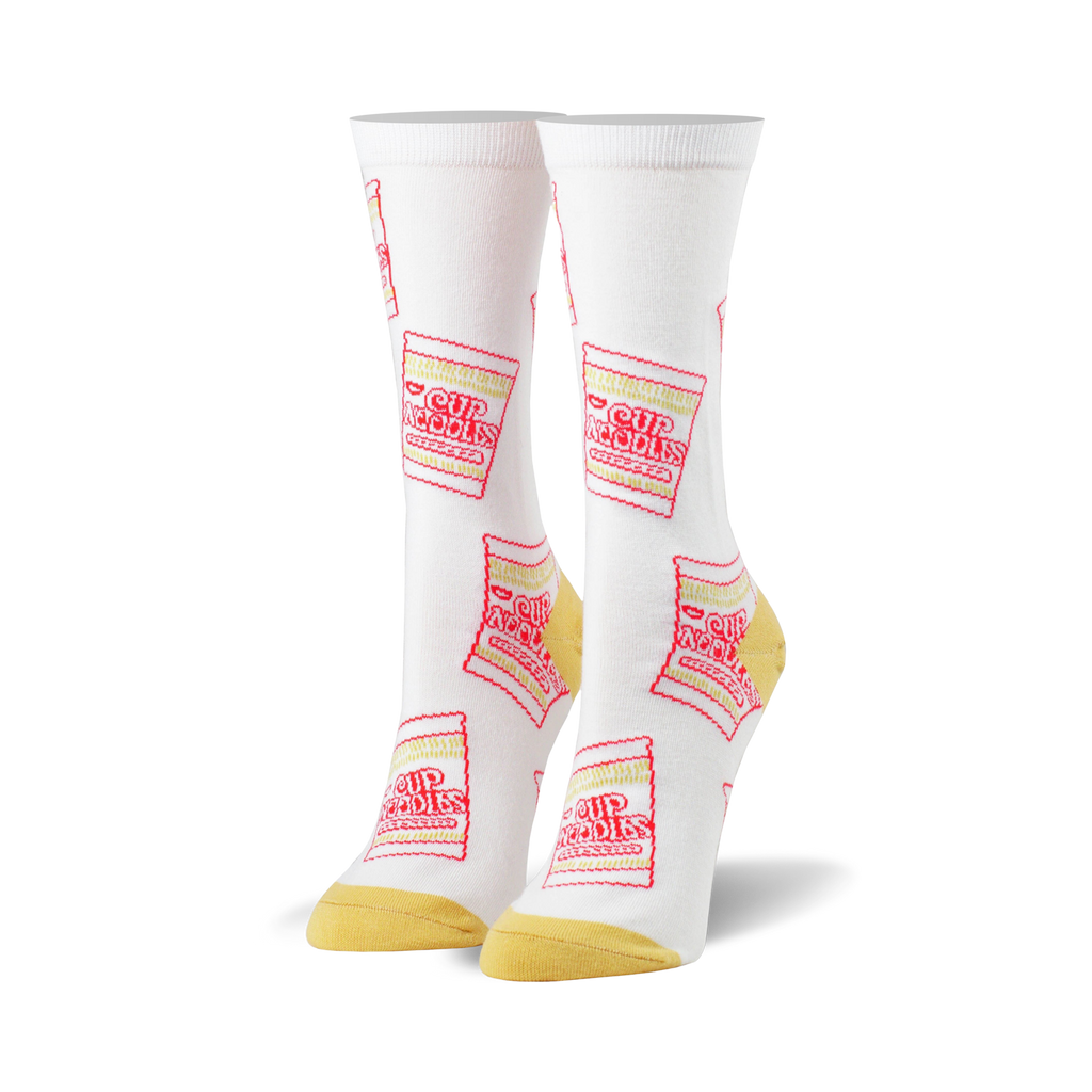 "Cup Noodles fanatics, embrace the taste of fun with our Cup Noodles Cup Crew Socks! These white socks feature an allover print of red and yellow Cup Noodles soup packages, complete with the iconic Cup Noodles logo. Just like the beloved instant noodles, these socks bring a burst of energy to your feet, keeping you comfy and stylish. Show off your love for Cup Noodles and your playful side with every step."