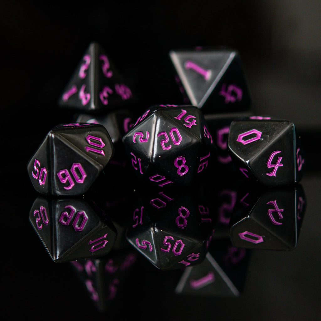 Our acrylic dice are carefully poured into individual molds and cured inside a vacuum chamber to insure no air bubbles are trapped inside the dice. After curing, each individual die is removed from the mold and numbers are painted by hand. These dice are perfect for any RPG and will sure to impress at your upcoming session!