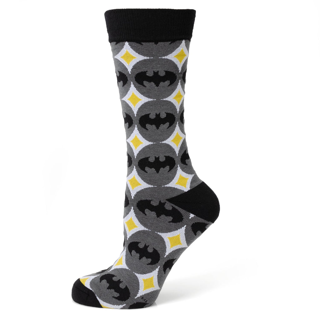 Wear your love for one of DC's beloved heroes with our Batman Circle Gray Black Men's Socks. The iconic black Batman logo sits in the center of charcoal circles which are highlighted by yellow and white diamond motifs, capturing Batman's signature colors. Imbued with the power of superhero craftsmanship, our cotton blend socks are built to withstand the mightiest battles while making sure you'll always maintain your sharp, heroic look. Officially licensed by DC Comics.