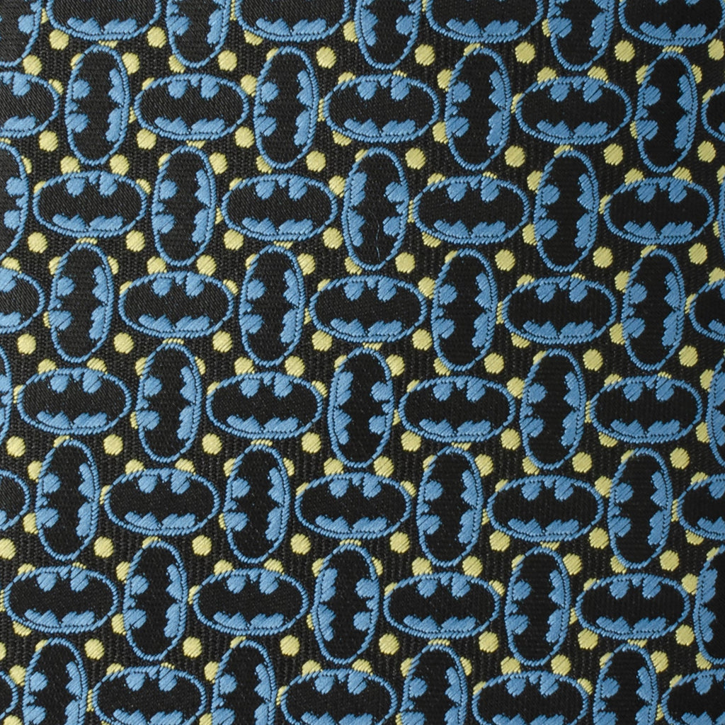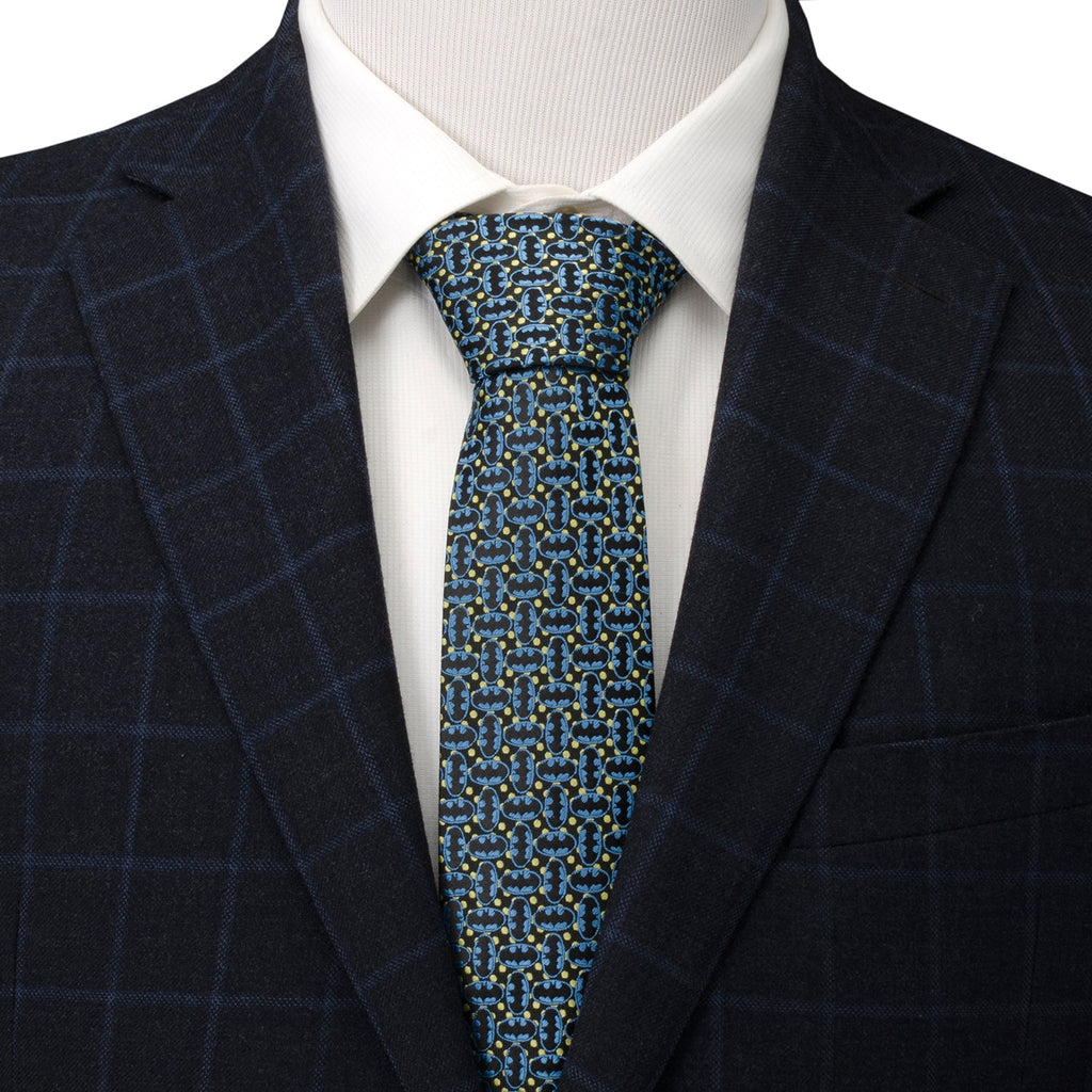 When you wear this tie, you'll hear the iconic Batman theme in your head. Black and blue Batman emblems create an alternating pattern on the black base. Tight yellow dots add a pop of color, brightening the design. Imbued with the power of superhero craftsmanship, our Silk Blend tie is built to withstand the mightiest battles while making sure you'll always maintain your sharp, heroic look. Pairs well with our Satin Black Batman Logo Cufflinks. Officially licensed by DC Comics.