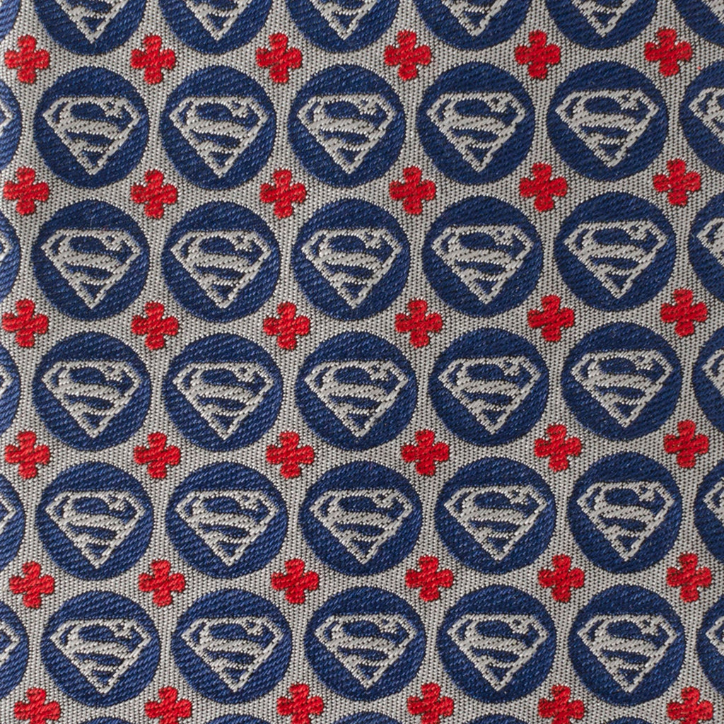 A tie perfect for the Man of Steel himself. Our Superman Shield Motif Gray Tie features iconic gray Superman Shield motifs enclosed in navy circles. Red floral motifs add a pop of color and compliment the design of the tie. Imbued with the power of superhero craftsmanship, our 100% Silk tie is built to withstand the mightiest battles while making sure you'll always maintain your sharp, heroic look. Pairs well with our Superman Navy Gemstone Cufflinks. Officially licensed by DC Comics.