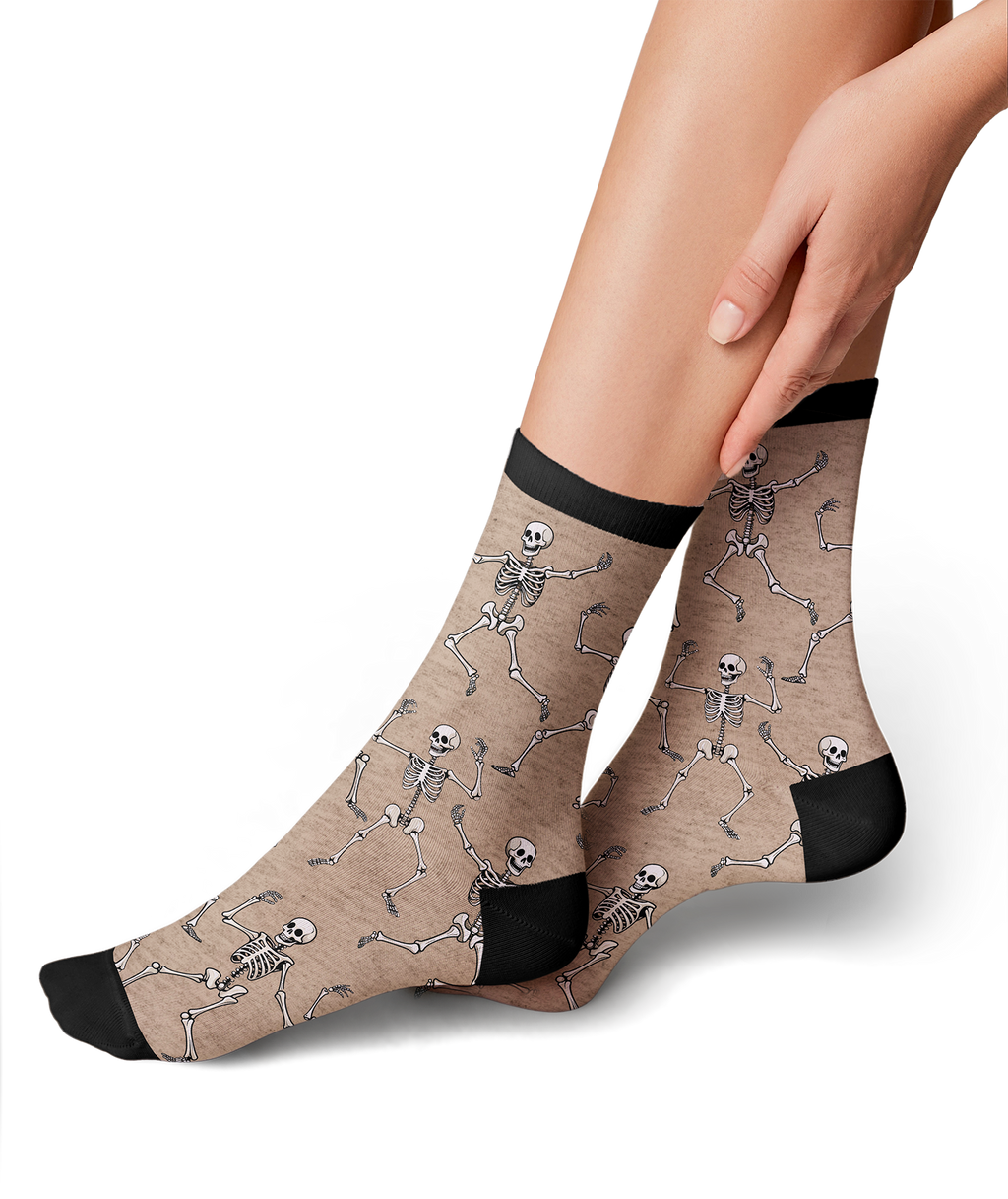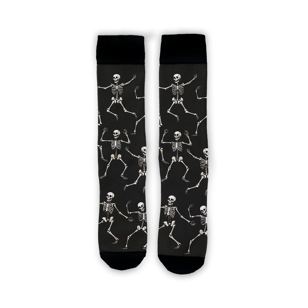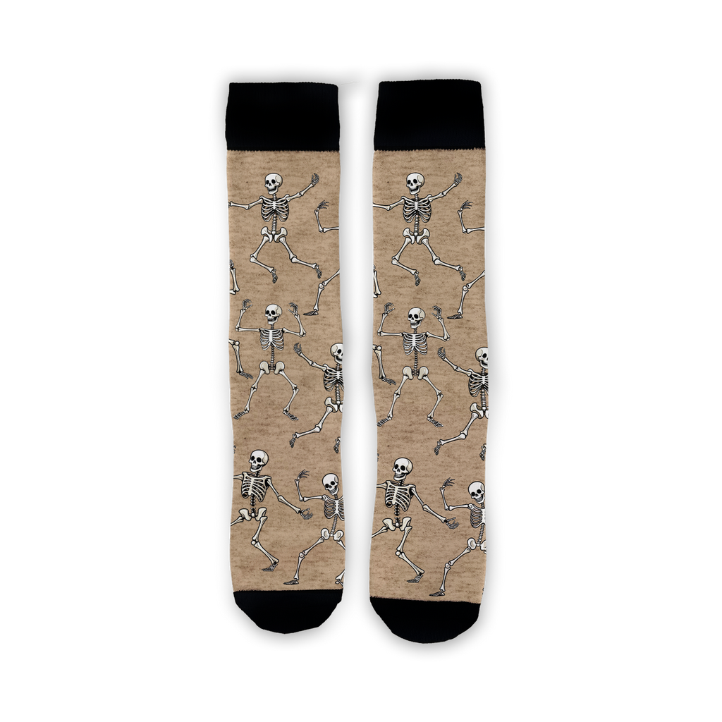 Get ready to boogie with the 'Dead Man's Party' socks! These crew socks feature a fun pattern of dancing skeletons- some are shown doing the twist, others are striking a pose. The visible parts of the socks come in two colorways: a tan-ish beige and a classic black. The skeletons are a crisp white-ish color against the background. They're comfy, cottony socks that are perfect for adding some spooky style to your everyday life. Think of them as your new favorite party accessory- minus the messy cleanup.